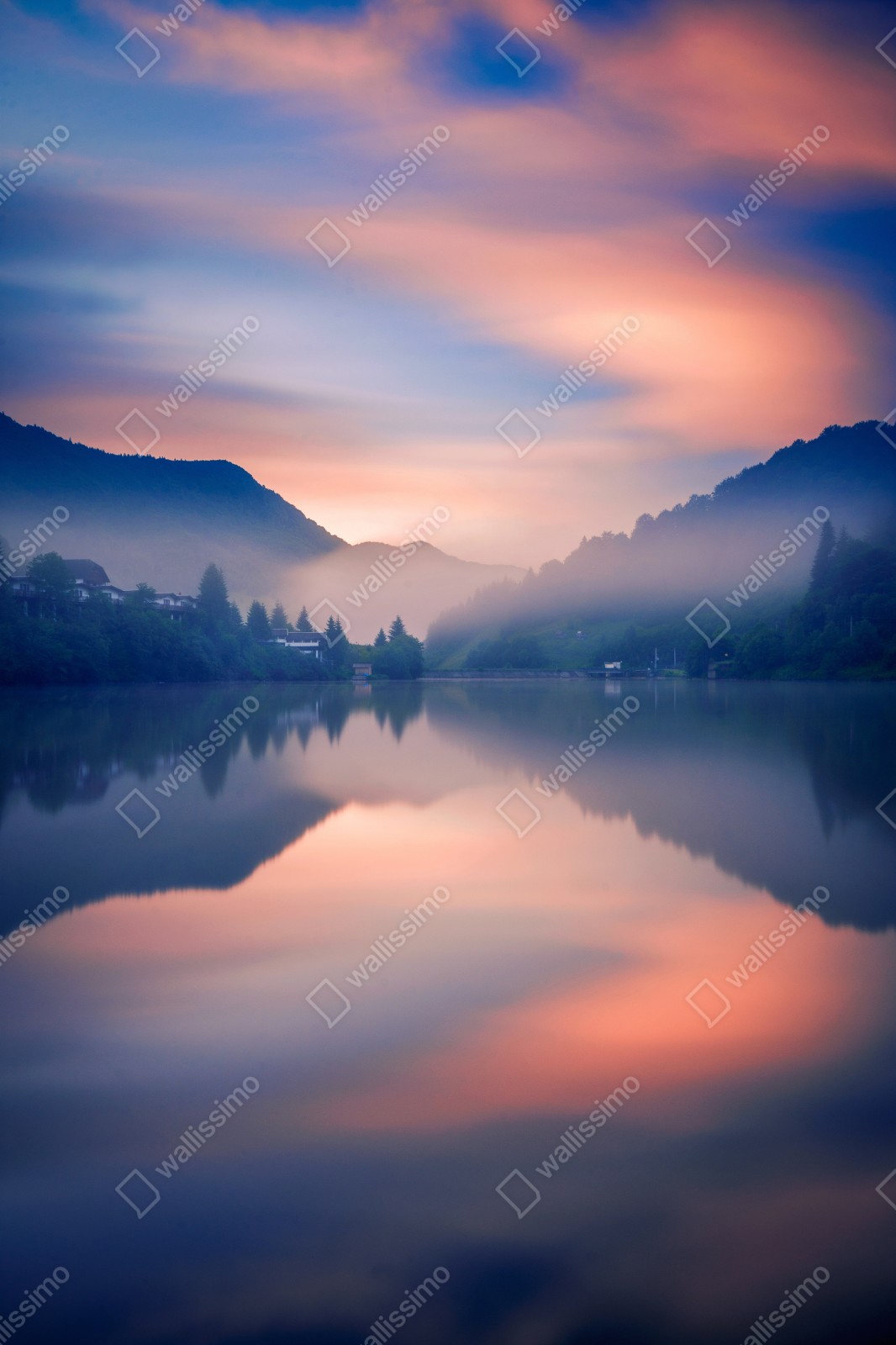 Entdecken Sie die beruhigende Schönheit eines nebelverhangenen Bergsees mit pastellfarbenem Himmel und spiegelnden Reflexionen, ideal für eine entspannte Atmosphäre.