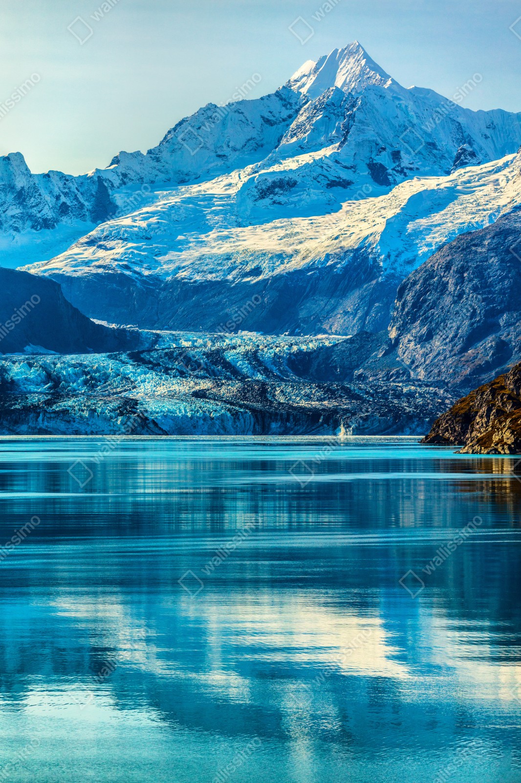 Bringen Sie die ruhige Schönheit schneebedeckter Gipfel und gletscherklarer Gewässer in Ihr Zuhause mit diesem beruhigenden Landschaftsbild.