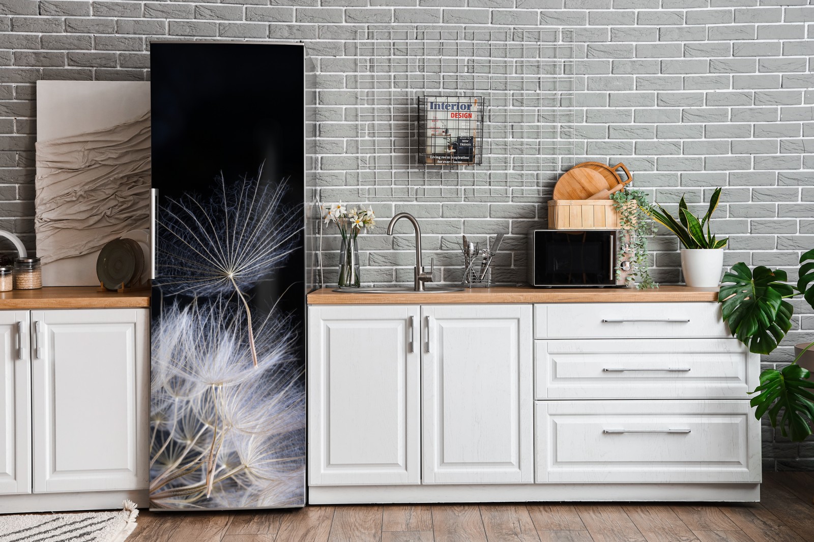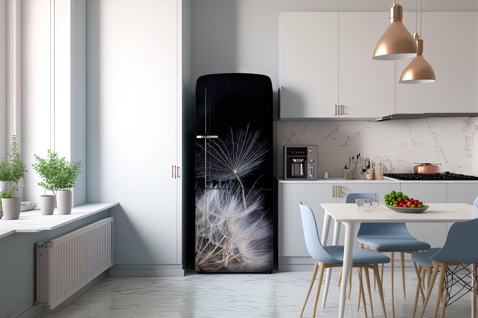 Kühlschrankaufkleber zarter löwenzahnsamen auf schwarzem hintergrund
