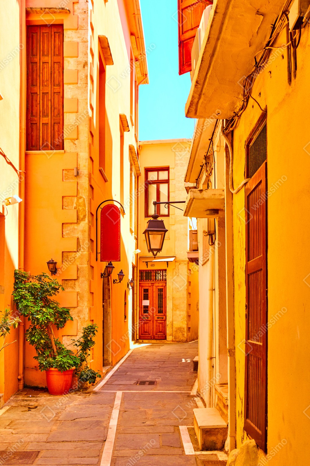 Bringen Sie mediterranen Charme in Ihr Zuhause mit einer sonnigen engen Gasse in Rethymno, Kreta; warme gelbe Fassaden und klassische Laternen schaffen eine einladende, reiseinspirierte Atmosphäre.