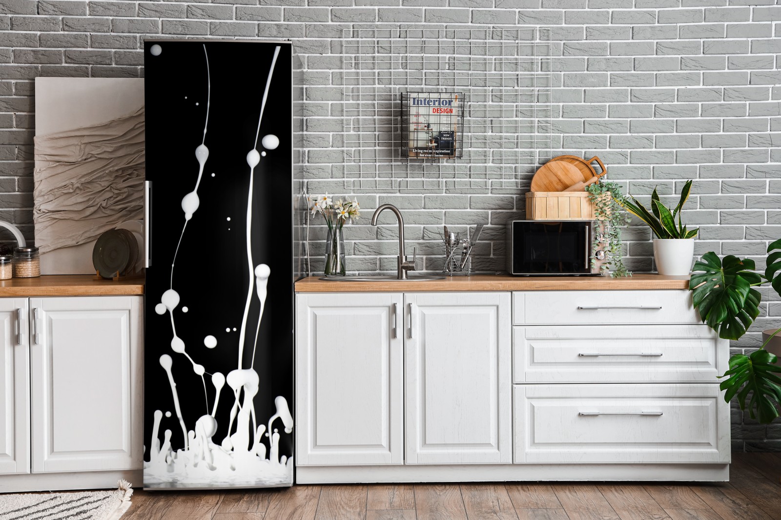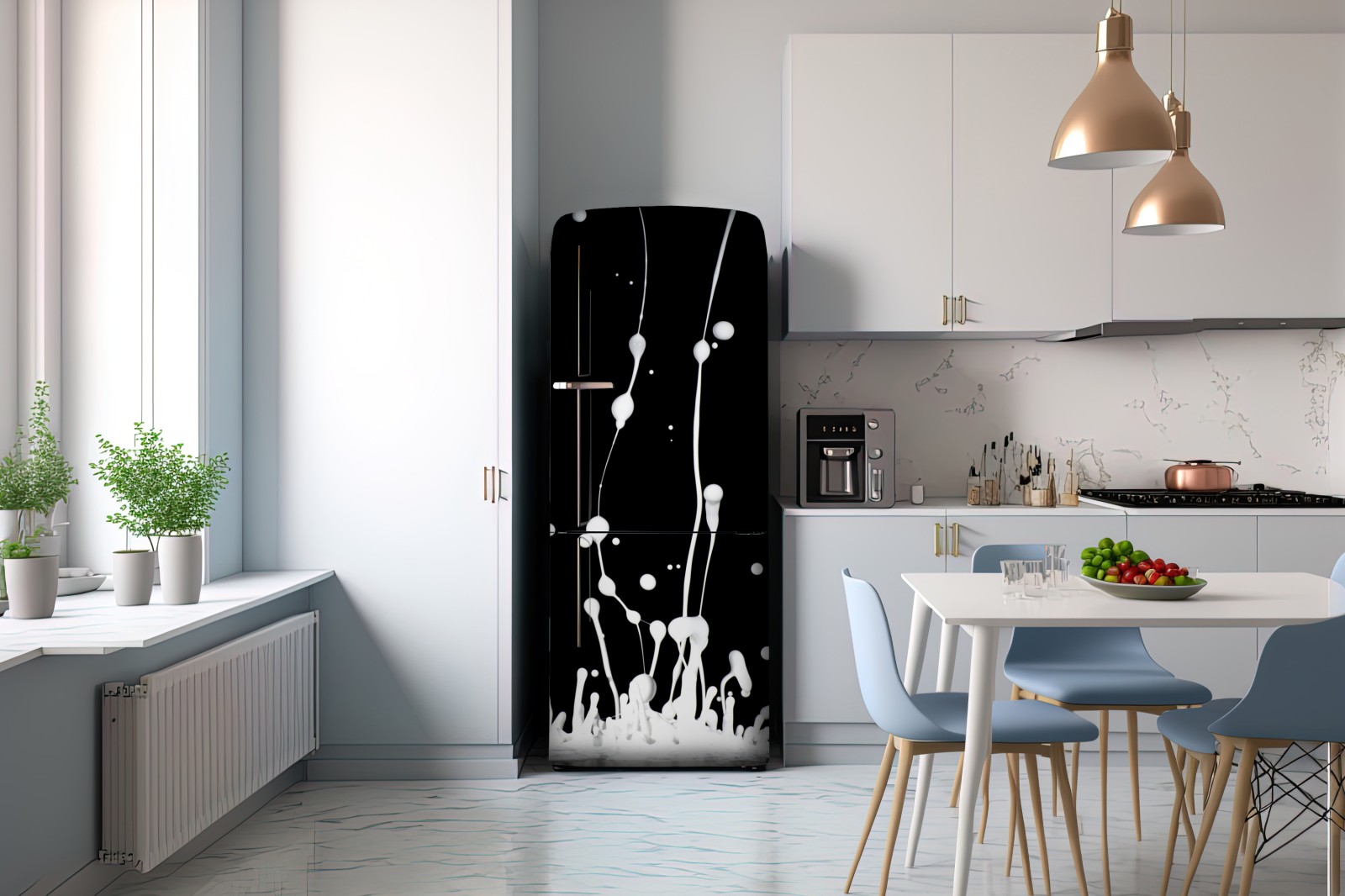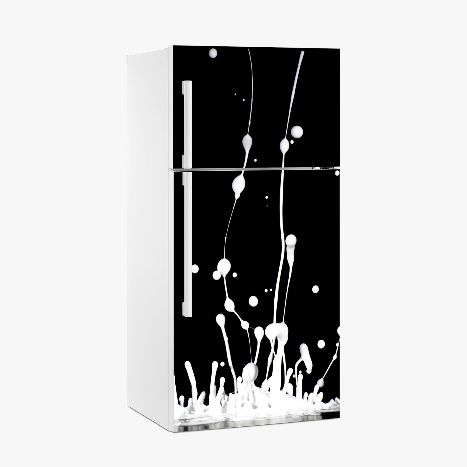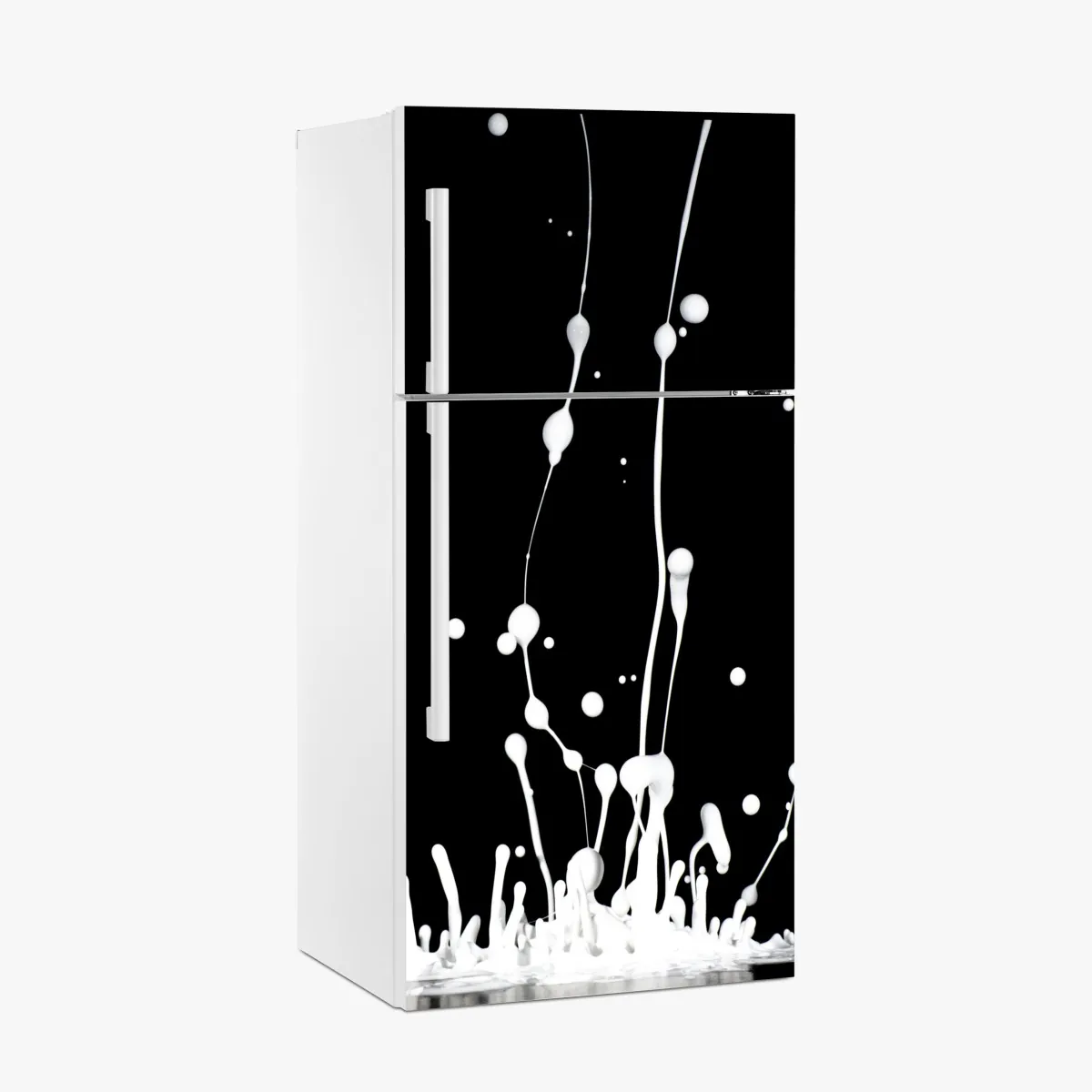 Kühlschrankaufkleber weiße flüssigkeitsspritzer auf schwarzem hintergrund