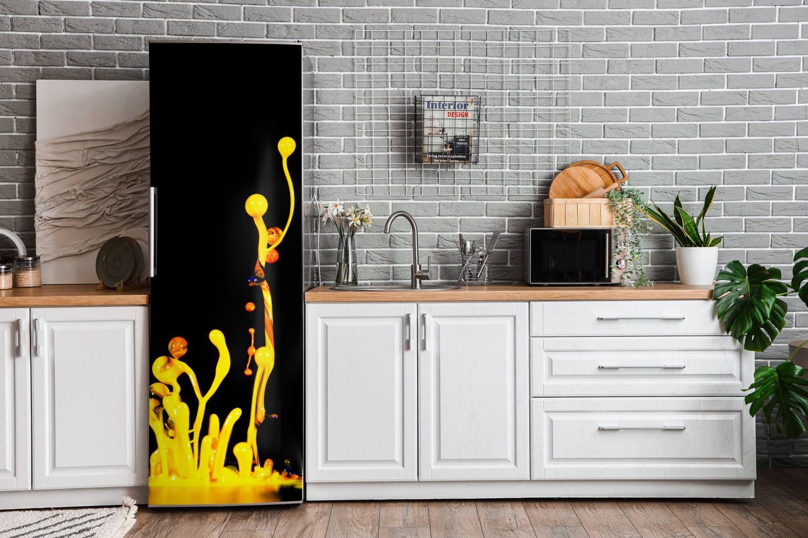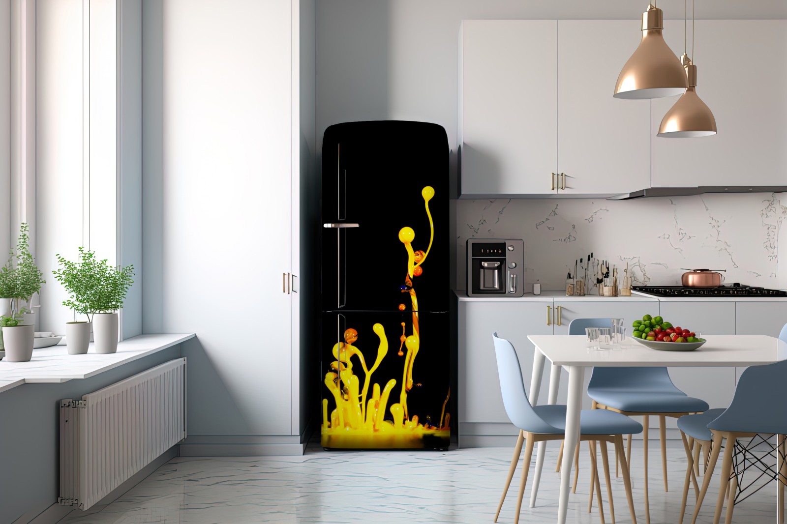 Kühlschrankaufkleber leuchtender gelber farbspritzer auf schwarzem hintergrund