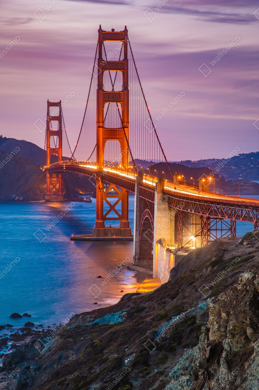 Bringen Sie die ikonische Golden Gate Bridge in dämmerungsfarben in Ihr Zuhause und schaffen Sie eine stimmungsvolle, moderne Wanddekoration voller Küstencharme.