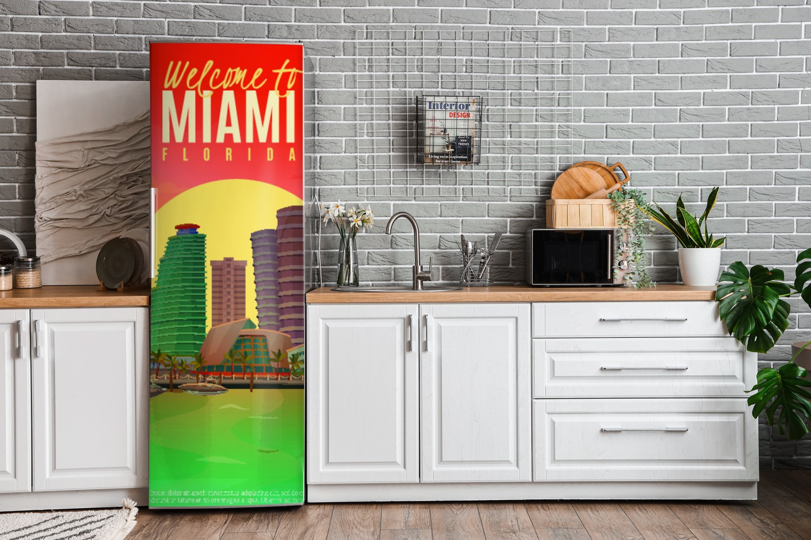 Bringen Sie tropische Stimmung und lebendige Farben in Ihren Raum mit dieser Miami-Skyline bei Sonnenuntergang.