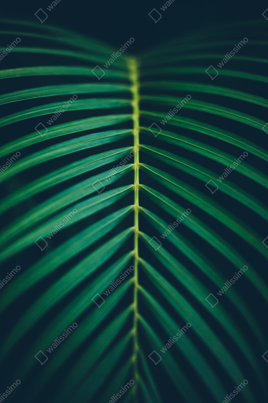 Verleihen Sie Ihrem Raum eine beruhigende tropische Note mit dieser Nahaufnahme eines grünen Palmenblatts, ideal als biophiler Blickfang in jedem Zimmer.