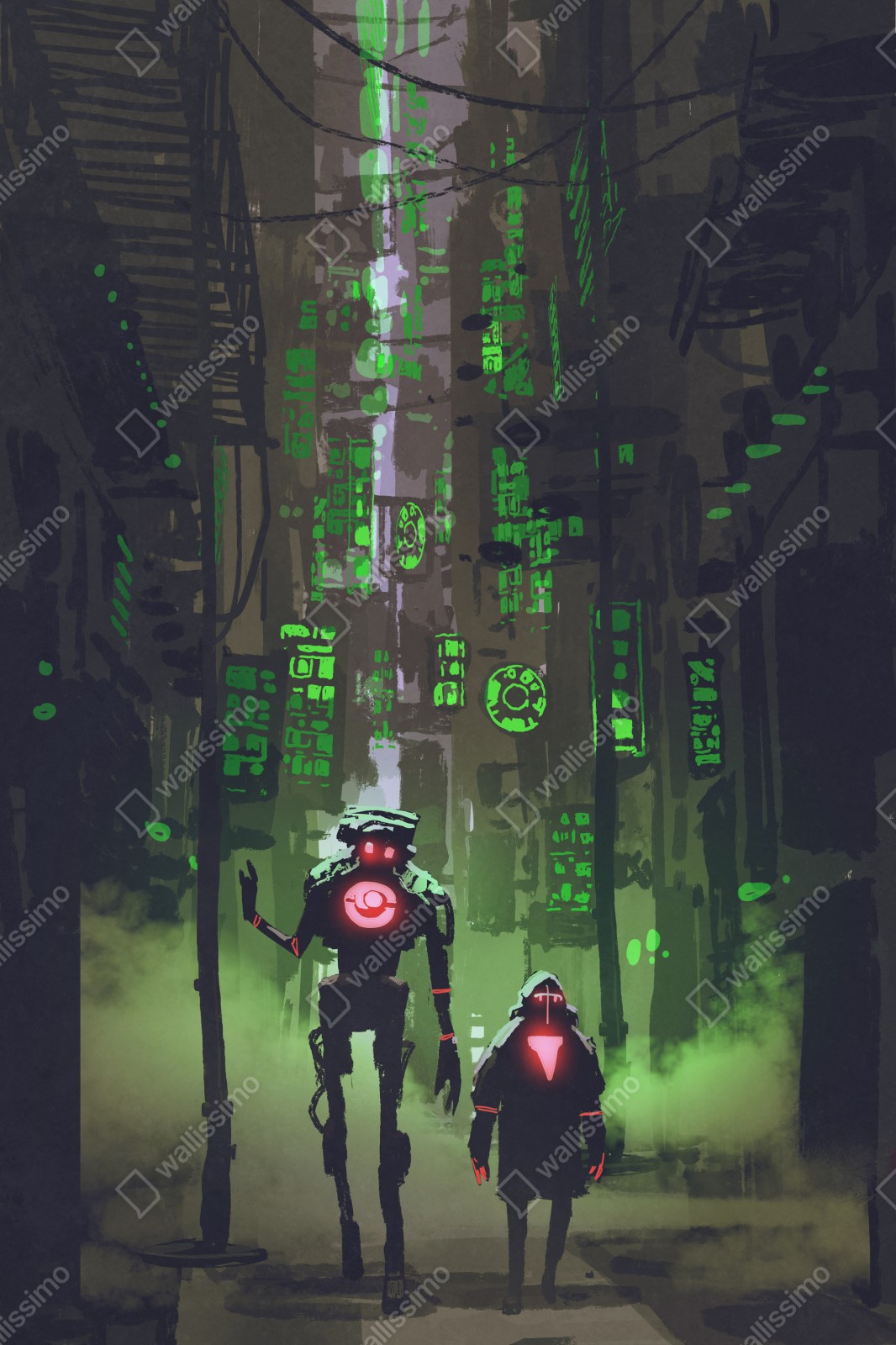 Erleben Sie eine futuristische Stadtszene mit robotischen Figuren im grünen Neonlicht, ideal für moderne Innenräume.