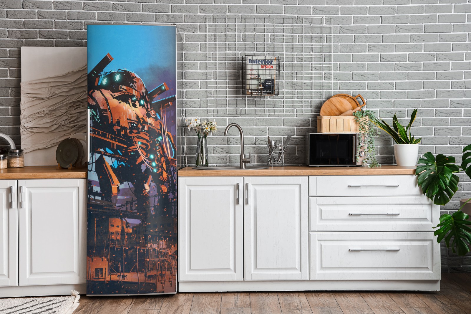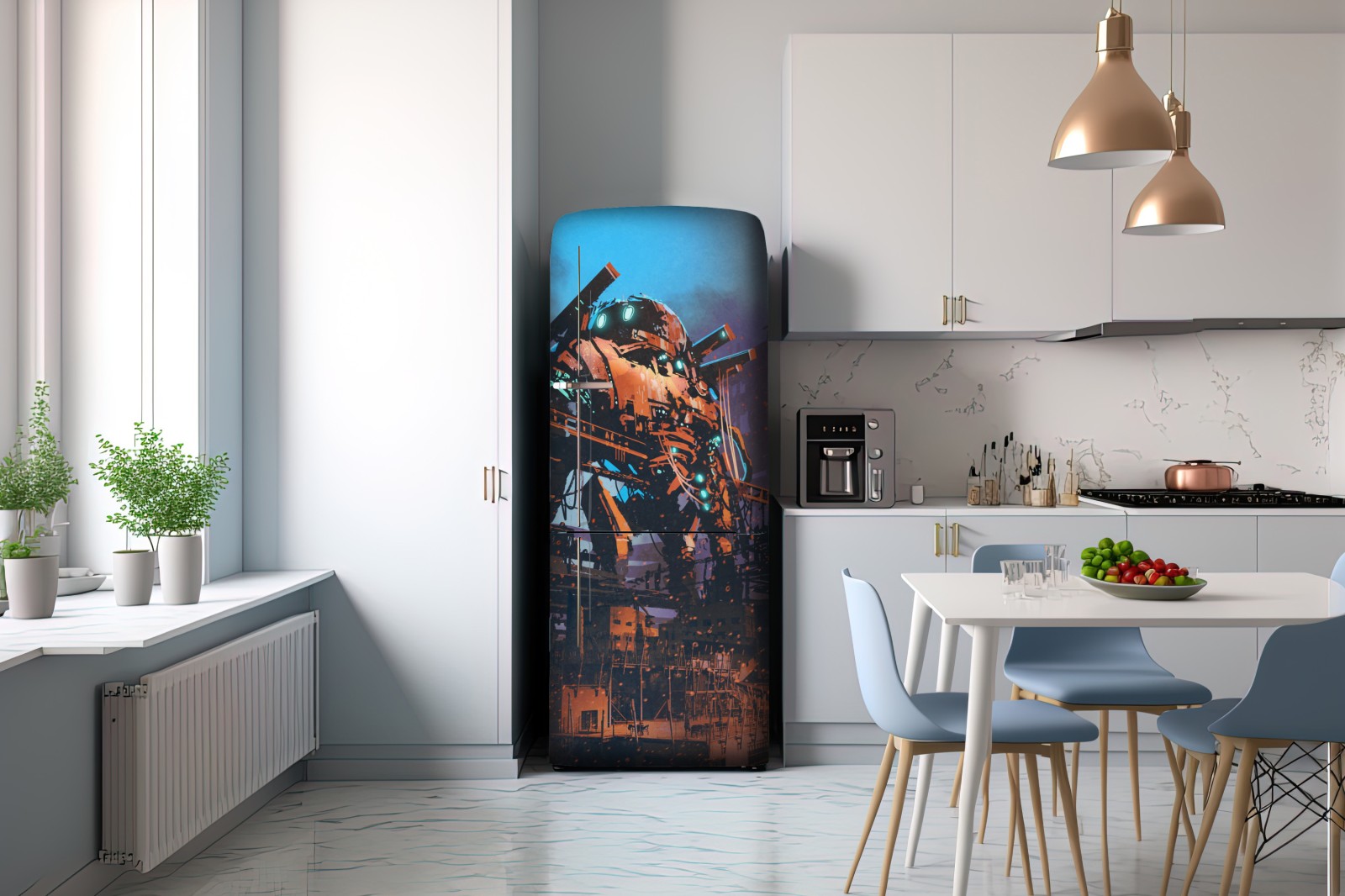 Kühlschrankaufkleber riesiger mech in verlassener fabrik