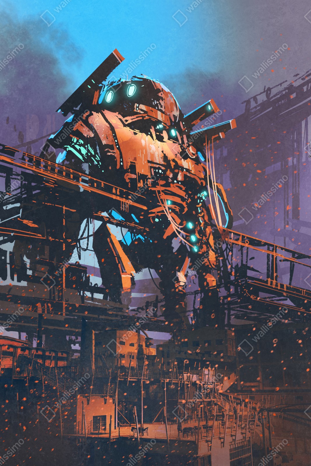 Verleihen Sie Ihrem Raum einen industriellen Sci‑Fi-Look mit dieser eindrucksvollen Darstellung eines riesigen Mechs in einer verlassenen Fabrik.