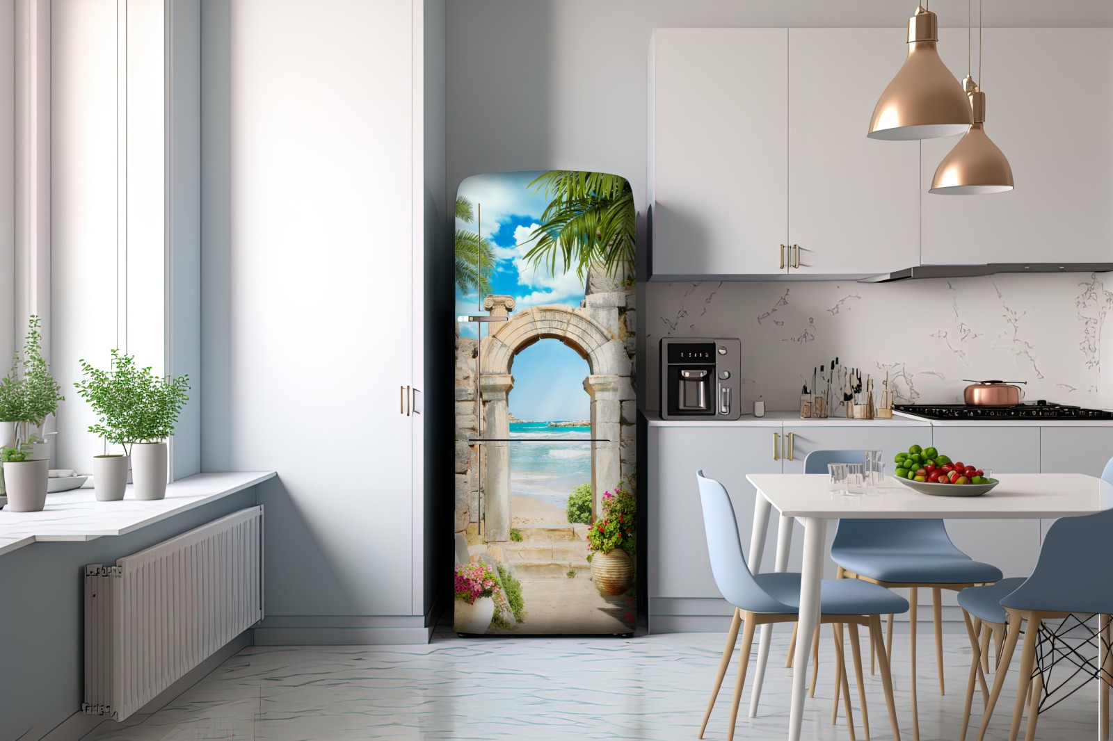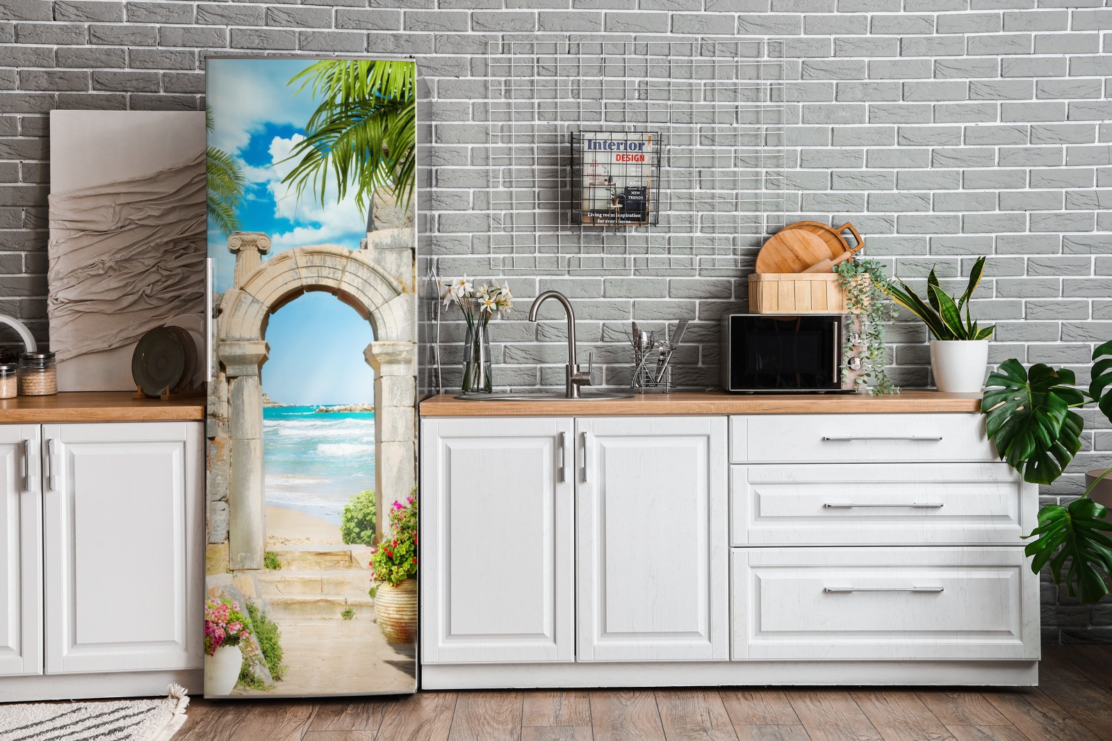 Bringen Sie mediterranes Flair in Ihr Zuhause mit diesem Bild eines sonnendurchfluteten alten Bogens, der zu türkisfarbenem Wasser führt.