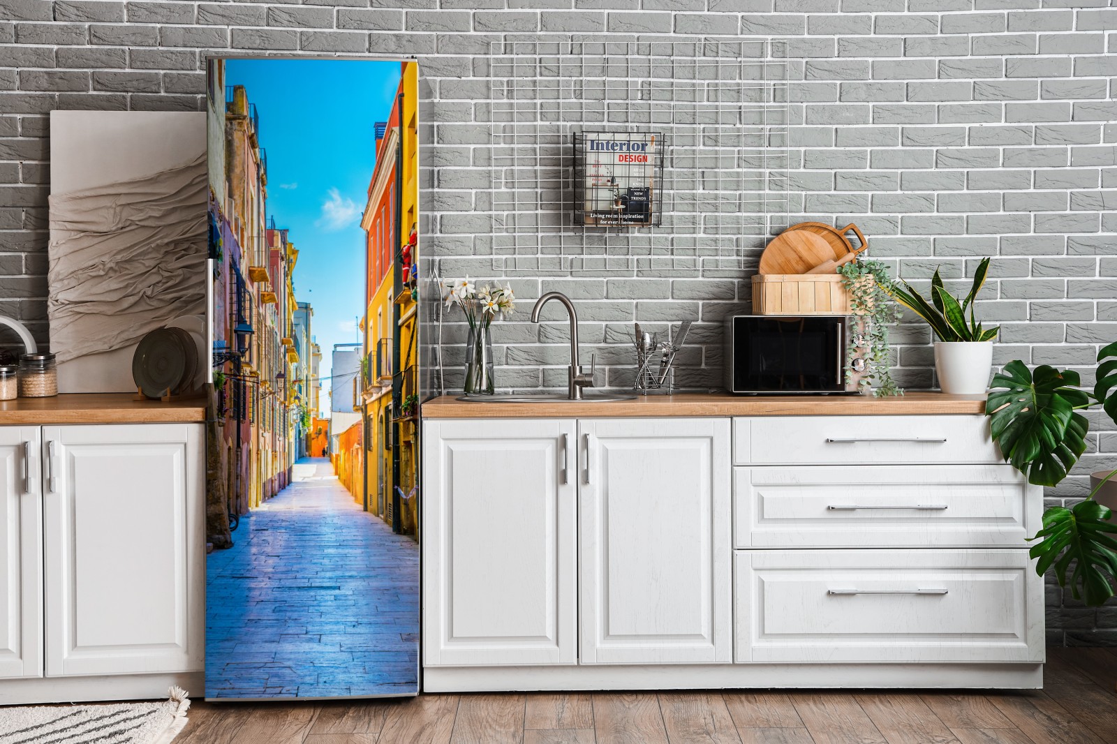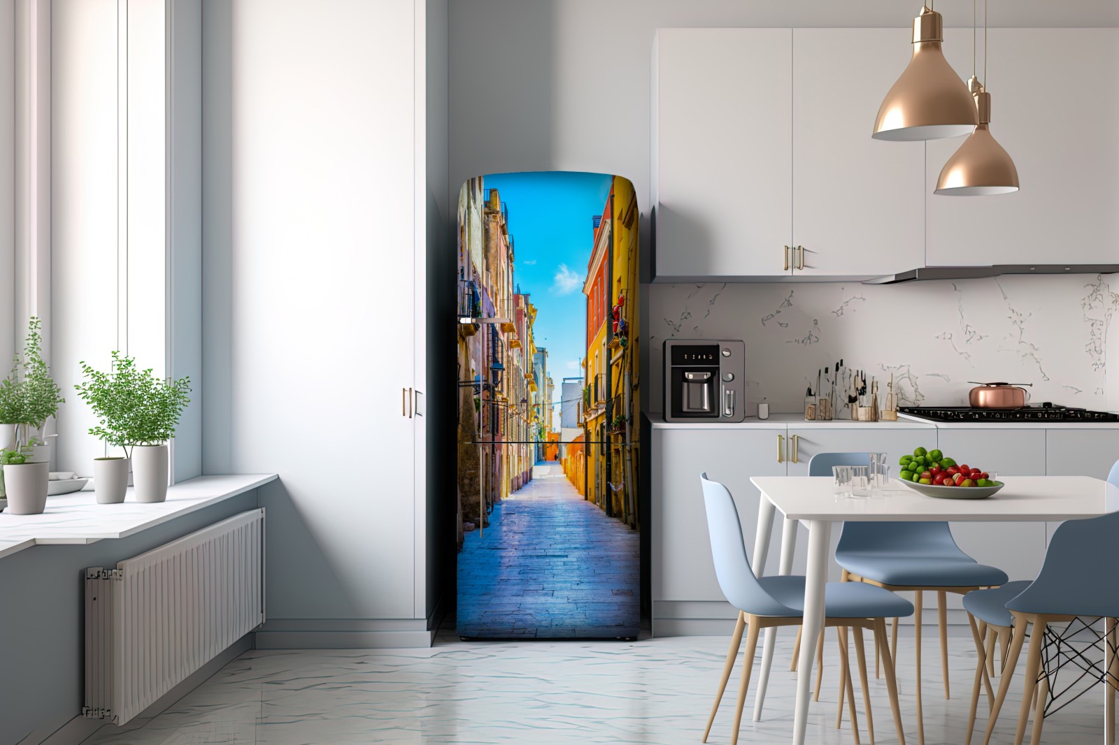 Kühlschrankaufkleber sonnenbeschienene mediterrane gasse mit bunten fassaden
