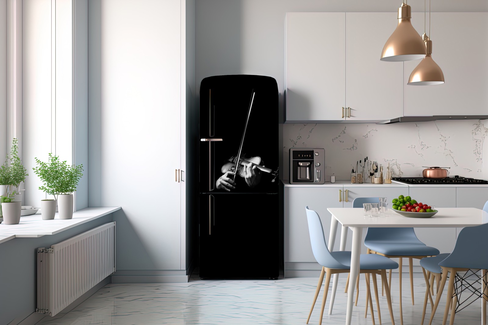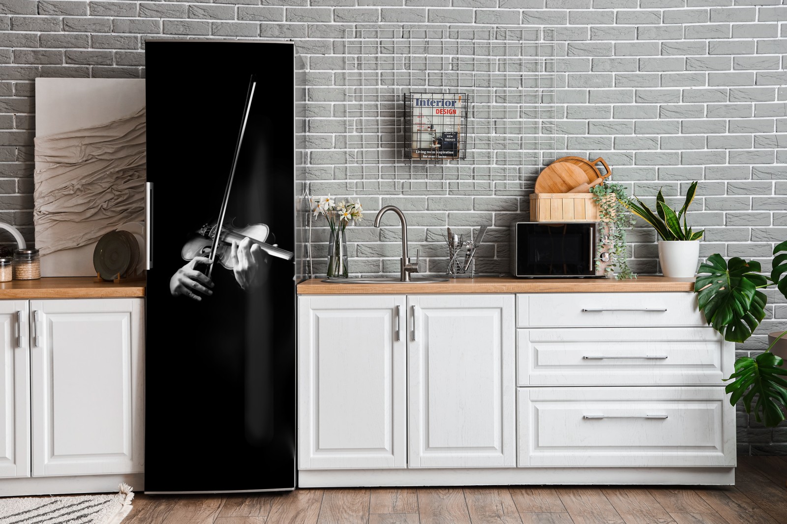 Elegantes schwarzweiß-foto von Händen und Geige vor tiefschwarzem Hintergrund, perfekt für moderne Wohnräume und Musikliebhaber.