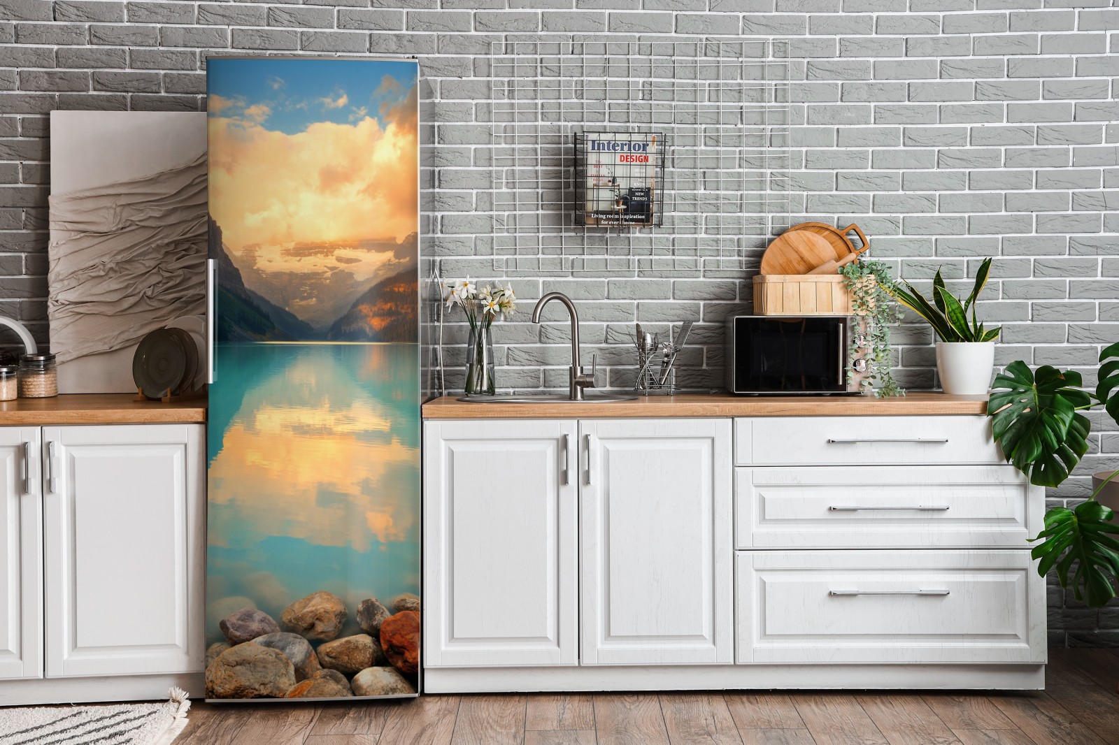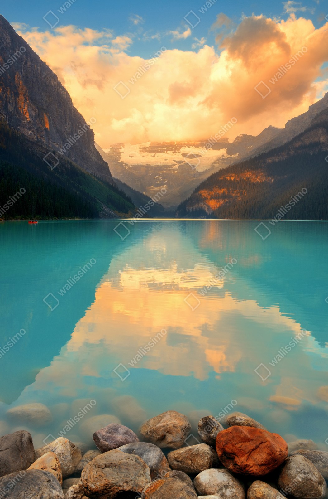 Bringen Sie ruhige Bergmorgen in Ihr Zuhause mit einem strahlenden Sonnenaufgang über Lake Louise und türkisblauem Wasser, das die Gipfel reflektiert.