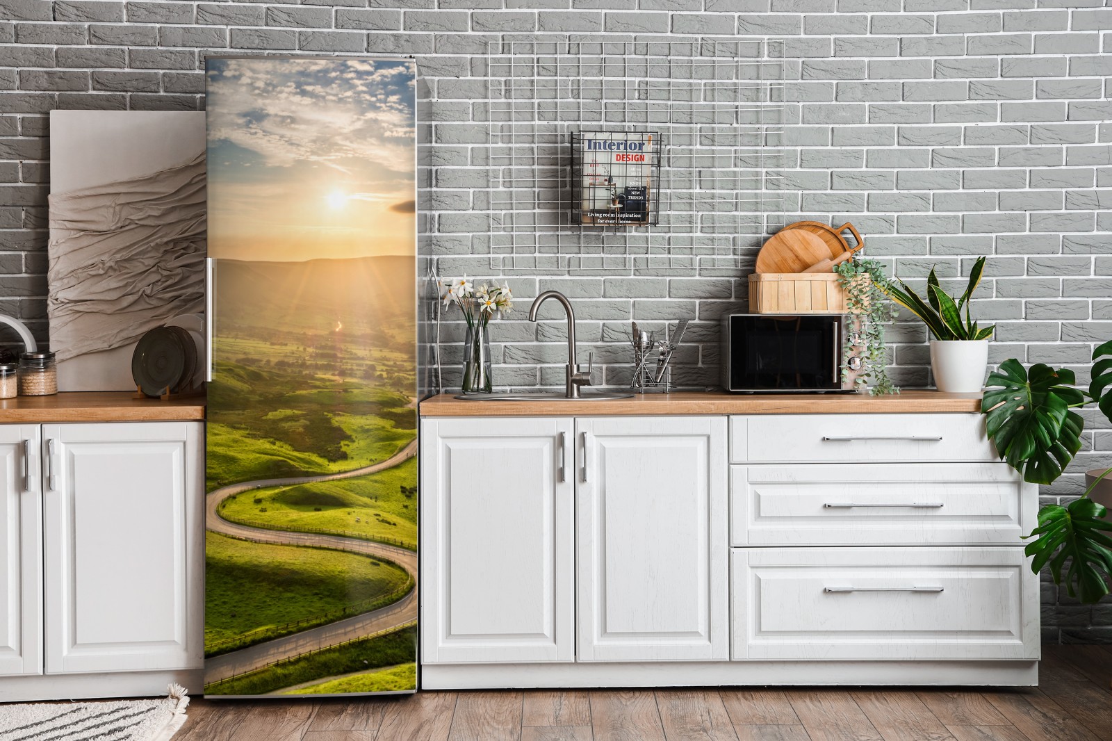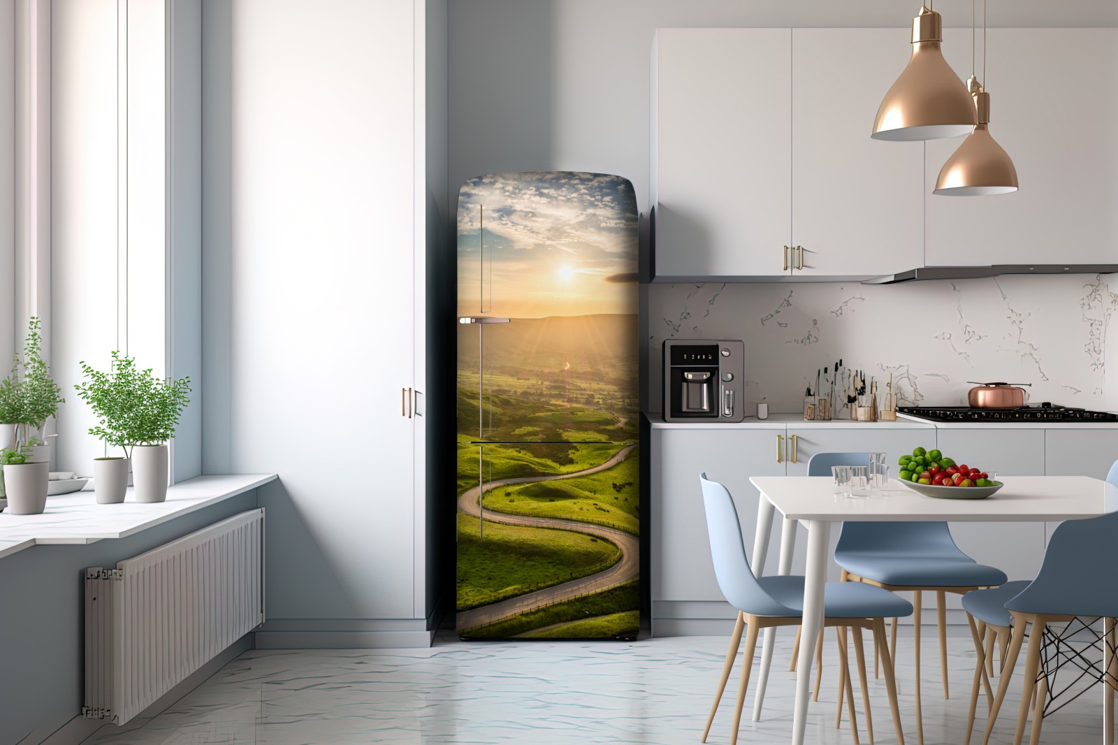 Kühlschrankaufkleber goldener sonnenuntergang über einer geschwungenen landstraße