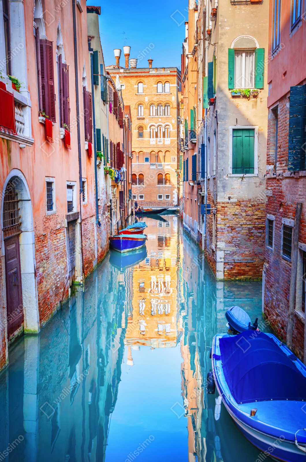 Bringen Sie den zeitlosen Charme von Venedig in Ihr Zuhause mit dieser lebendigen Kanalszene mit bunten Booten und ruhigen Spiegelungen.