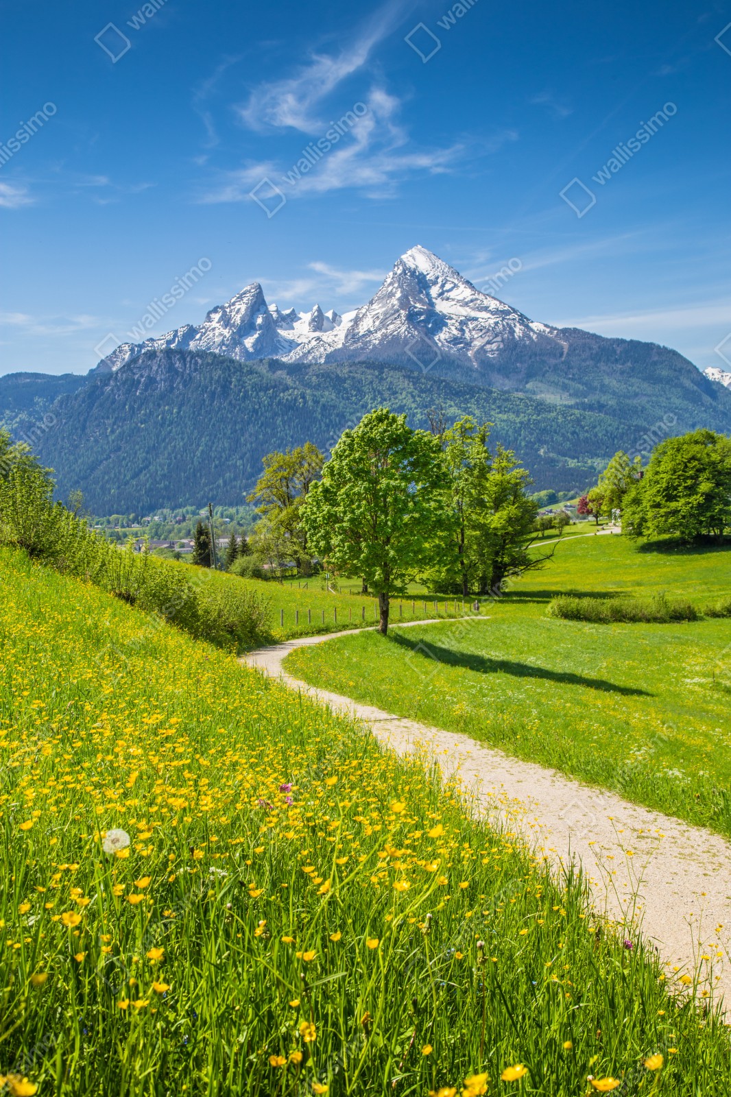 Bringen Sie die Ruhe der Alpenwiesen in Ihr Zuhause mit dieser lebendigen Landschaft mit geschwungenem Pfad, wilden Blumen und schneebedeckten Gipfeln.