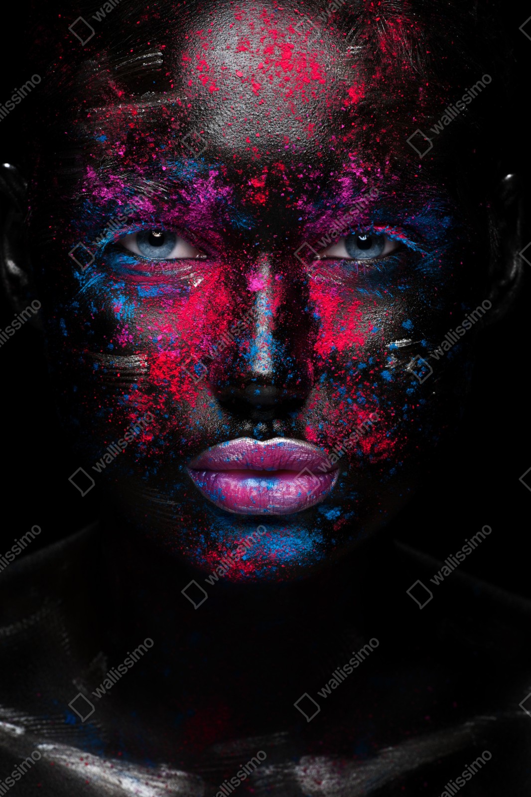 Bringen Sie kräftige Farben und modernen Charakter in Ihren Raum mit diesem dramatischen Neon-Gesichtsporträt vor tiefschwarzem Hintergrund.