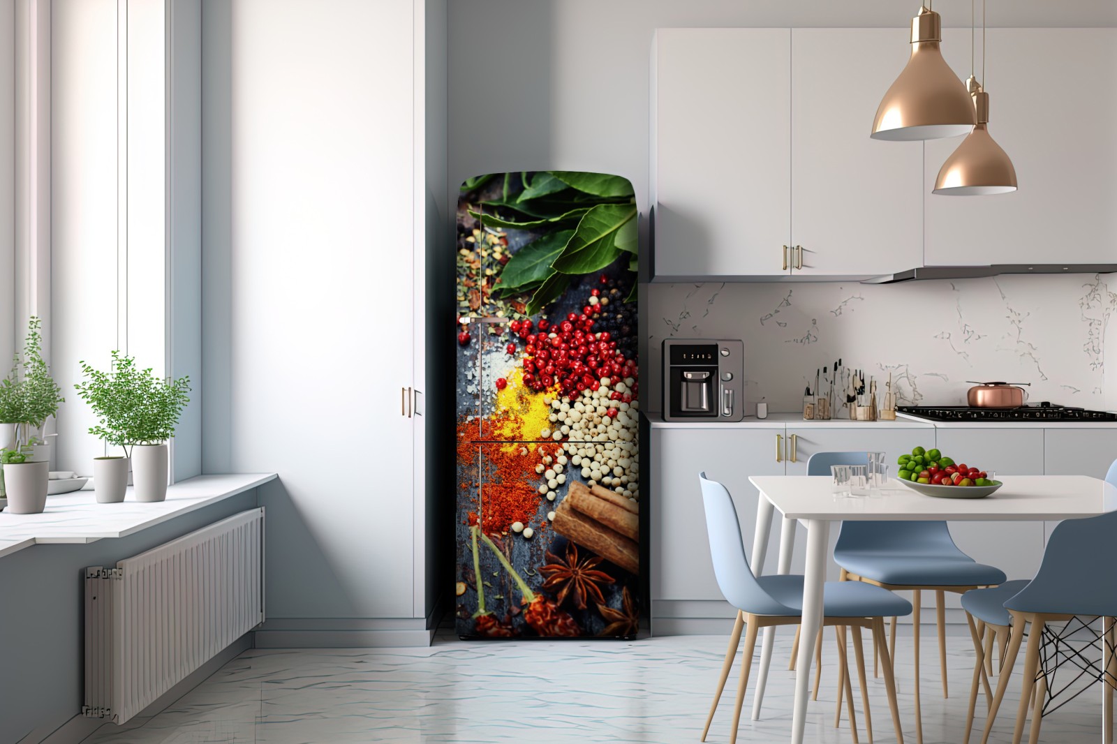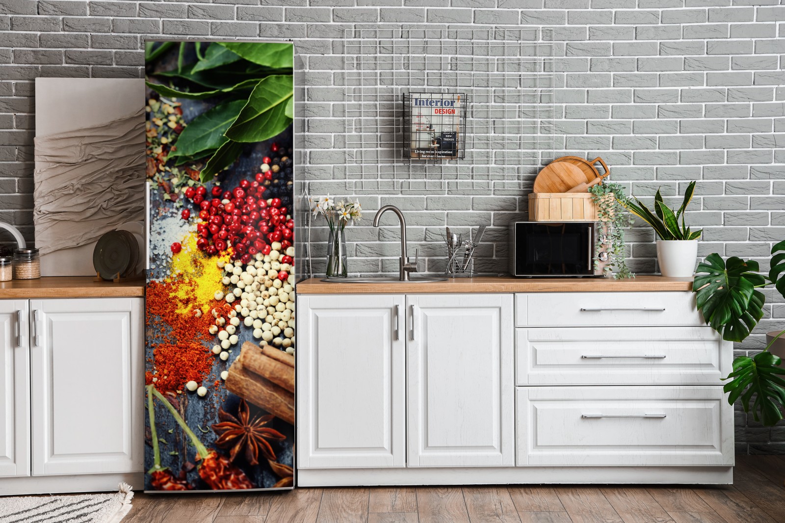 Kühlschrankaufkleber buntes gewürzsortiment auf rustikalem holz