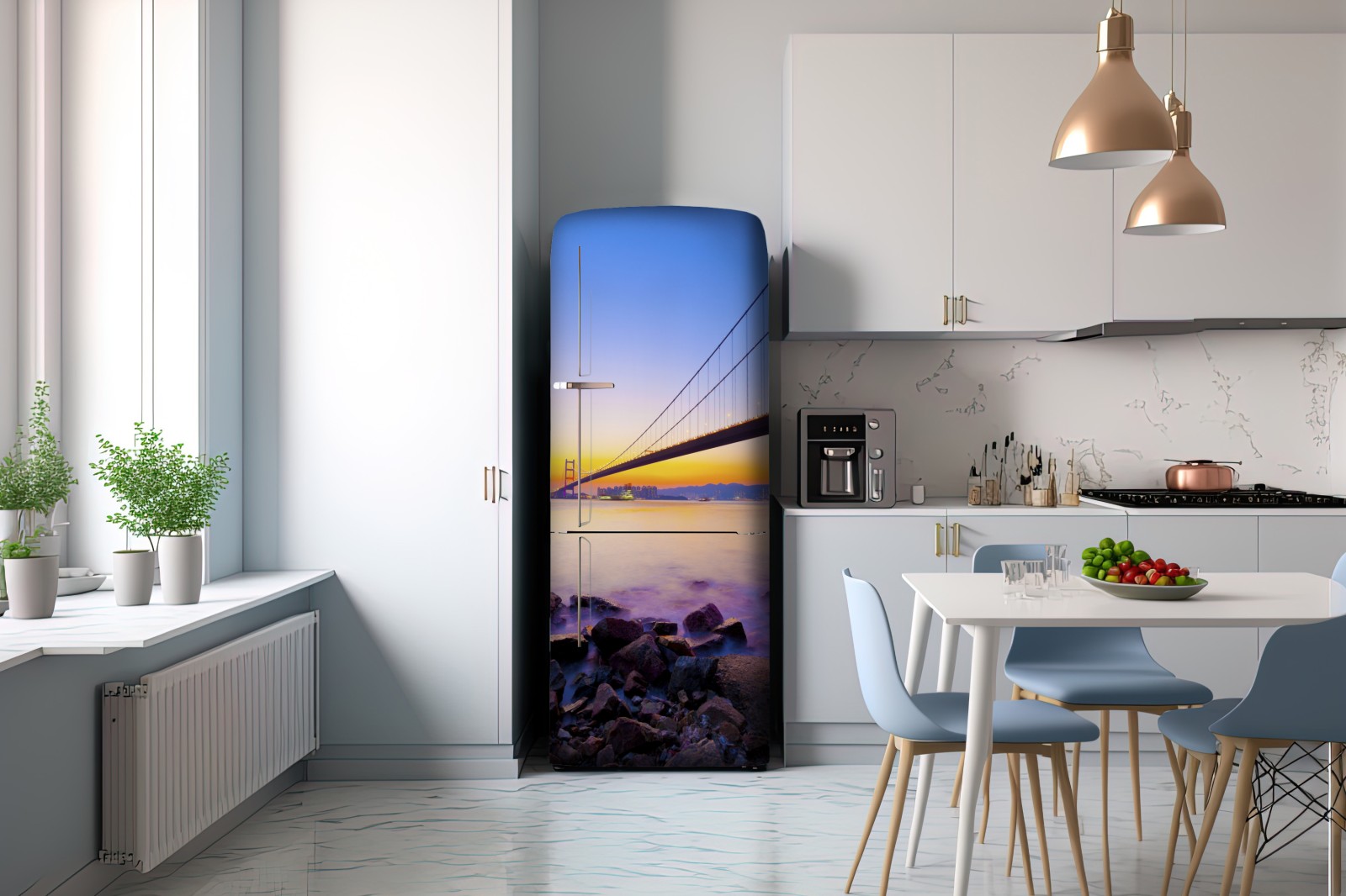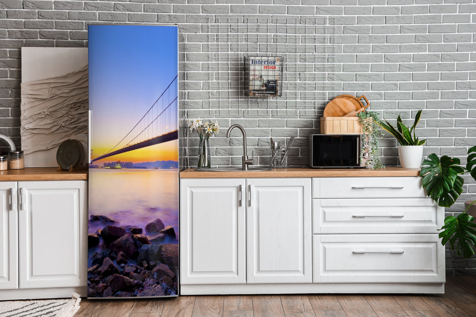 Kühlschrankaufkleber goldener sonnenuntergang über hängebrücke