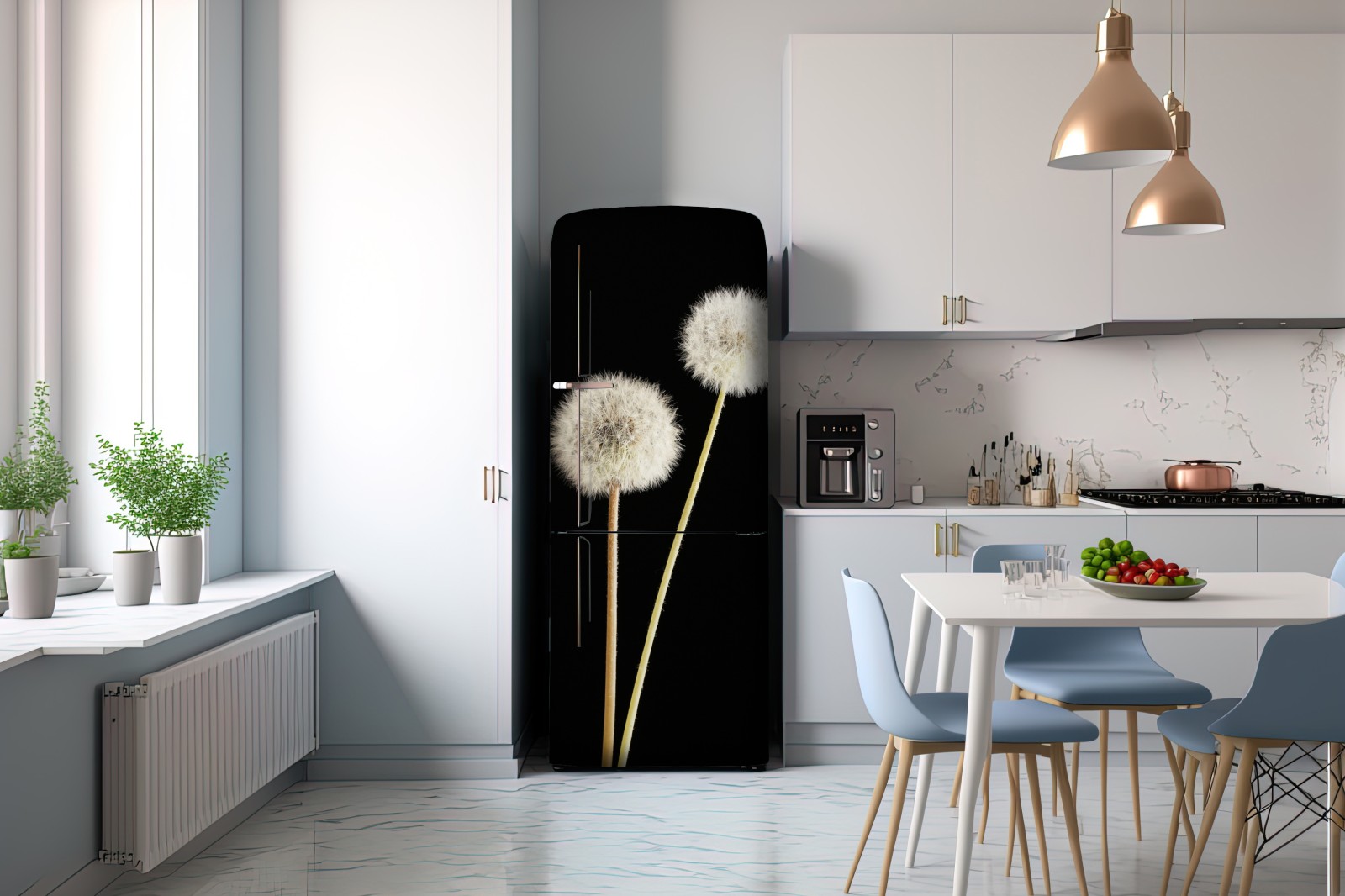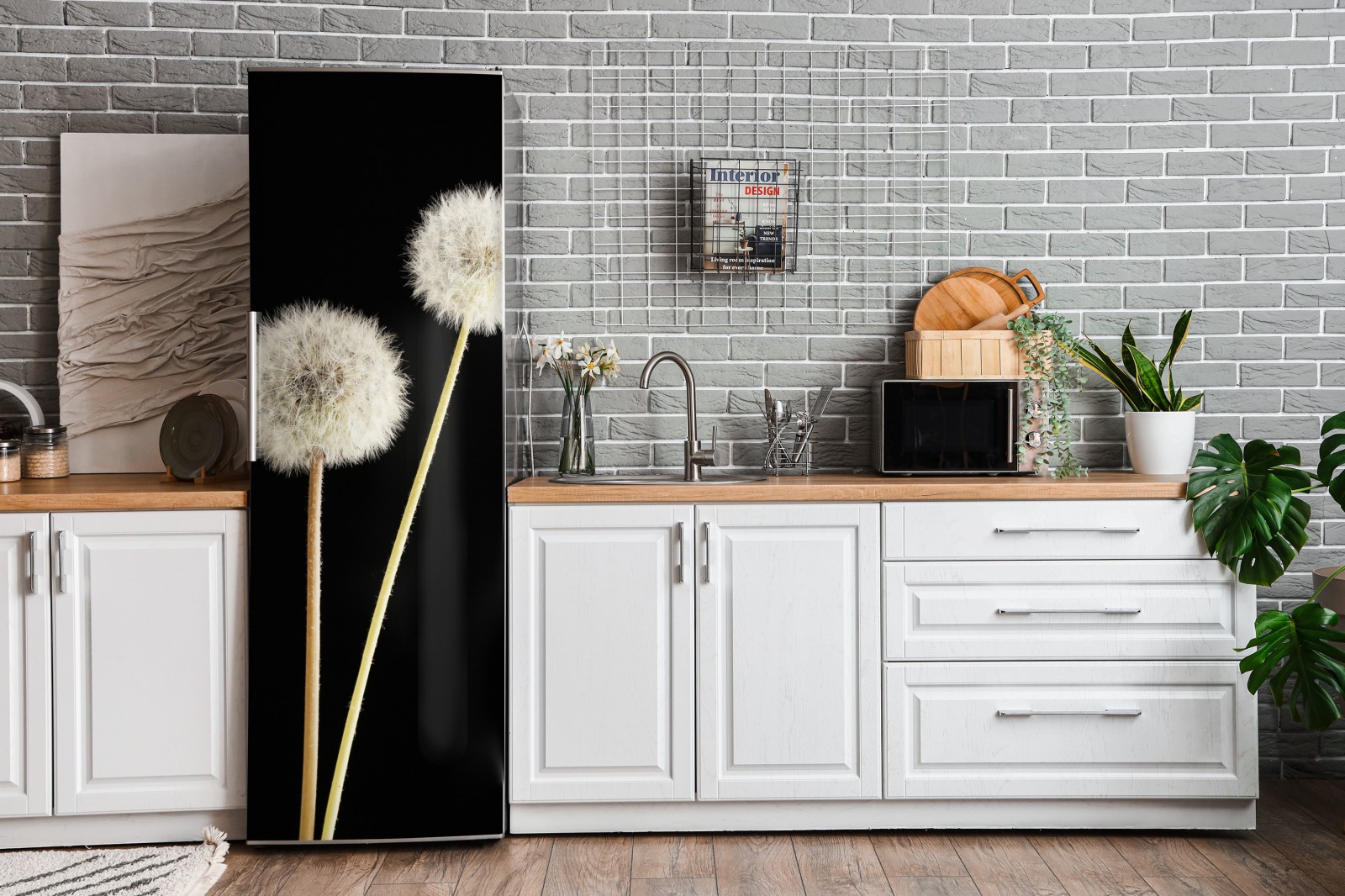 Kühlschrankaufkleber zarte löwenzahnsamen auf schwarzem hintergrund