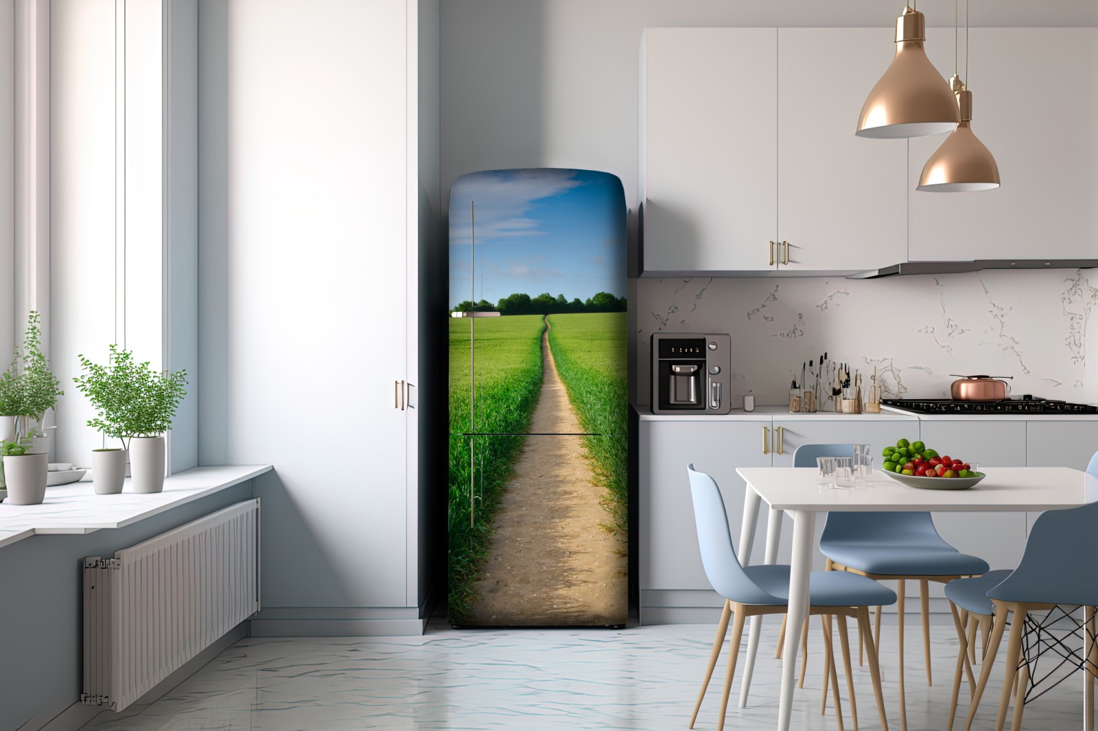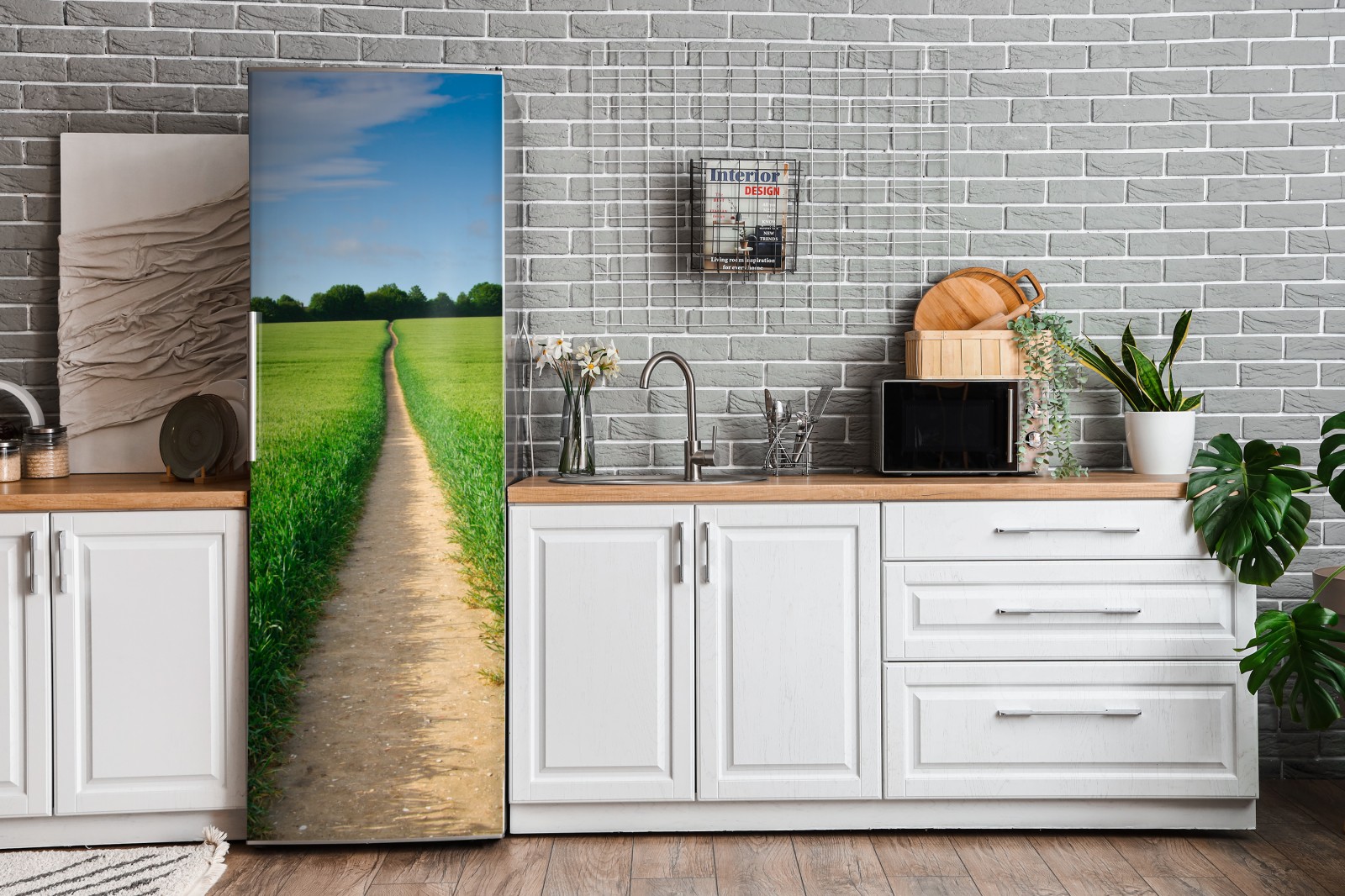 Kühlschrankaufkleber sonnenbeschienener weg durch grüne wiese