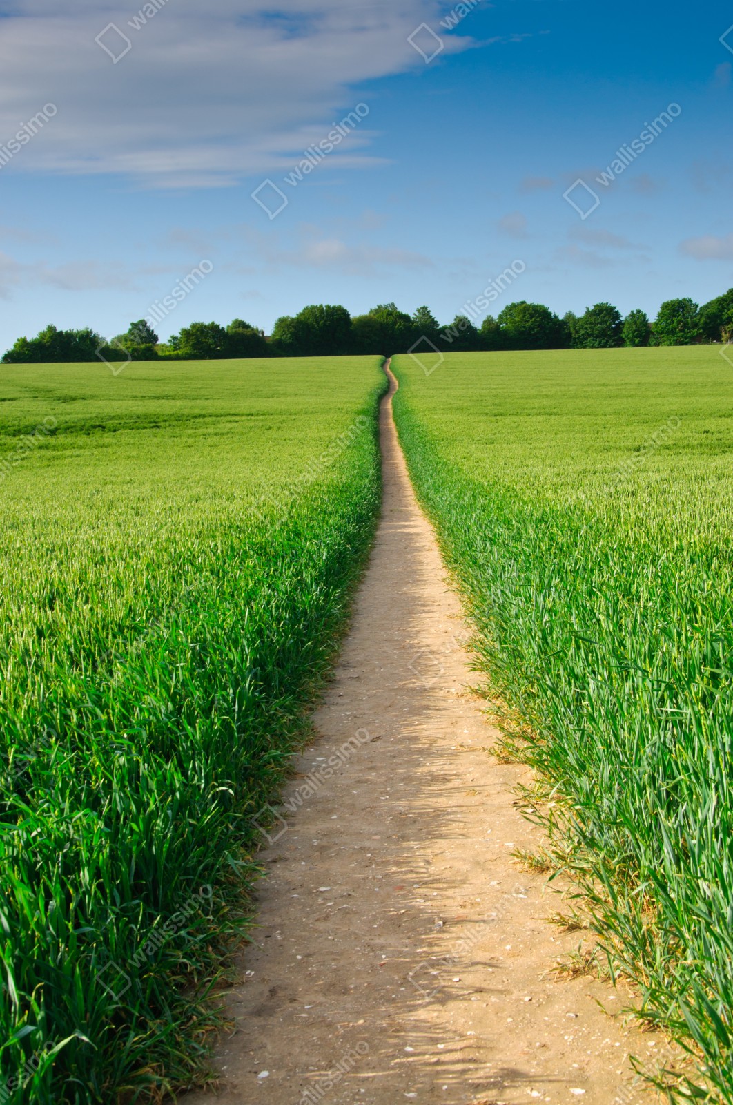 Bringen Sie Ruhe und natürliche Schönheit in Ihren Raum mit diesem lebendigen Foto eines Weges durch eine grüne, sonnenbeschienene Wiese unter klarem blauem Himmel.
