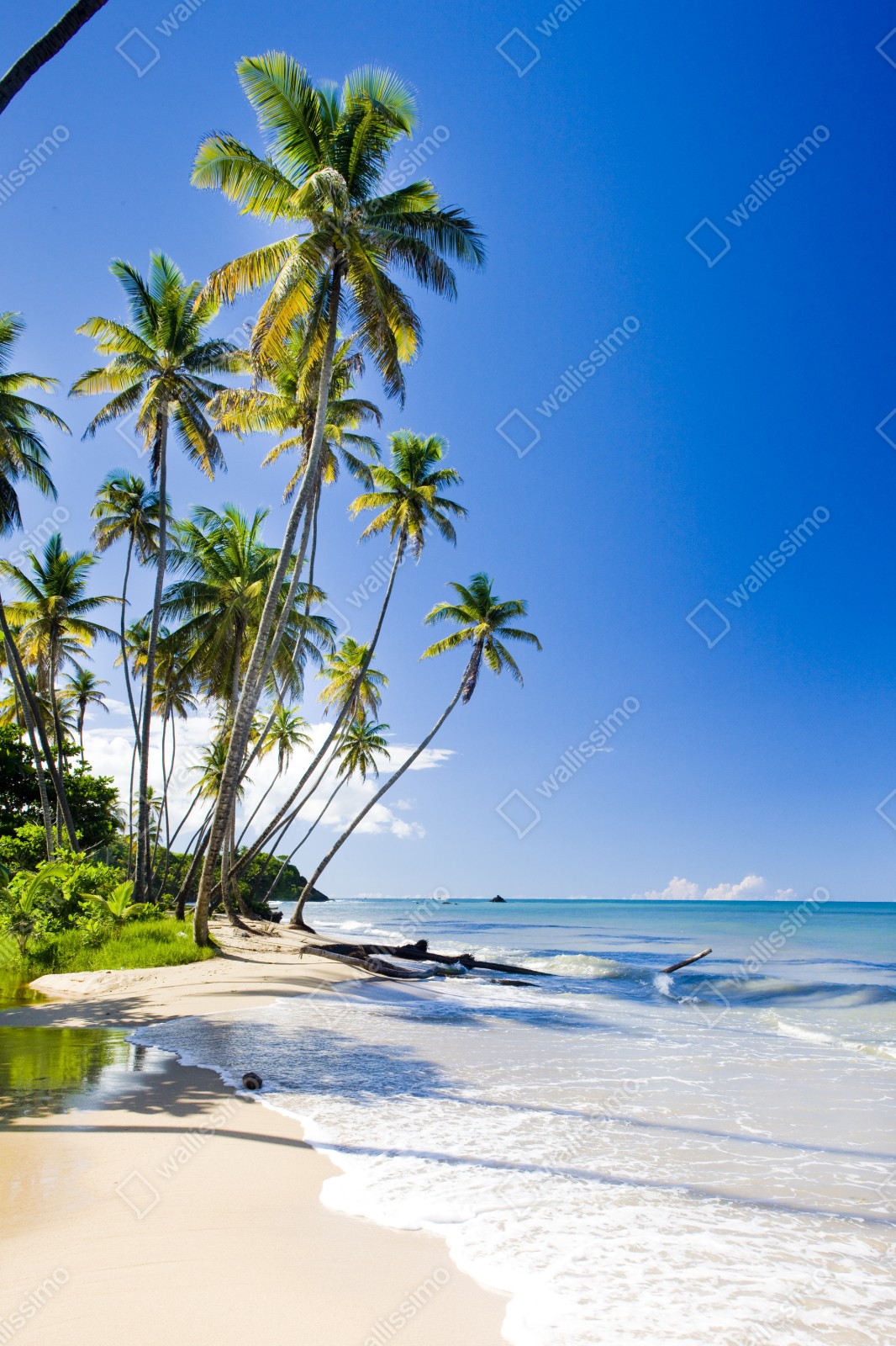 Bringen Sie mit dieser lebendigen Strandaufnahme mit wiegenden Palmen und türkisfarbenem Wasser eine ruhige tropische Atmosphäre in Ihren Raum.