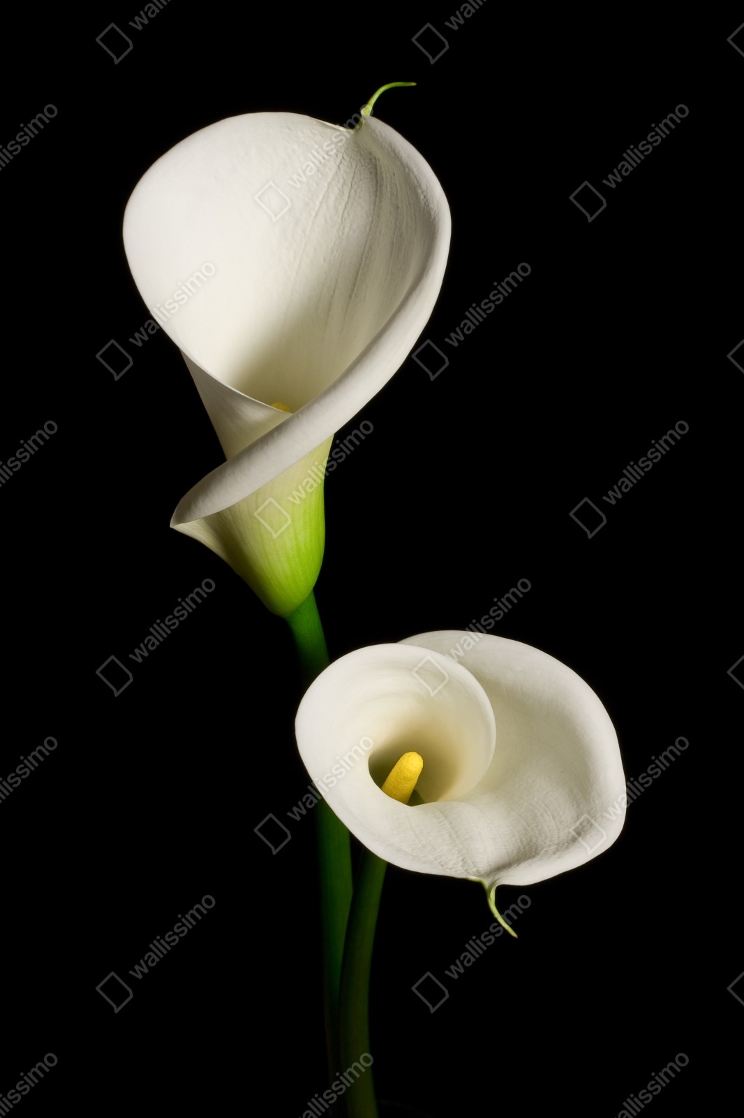 Verleihen Sie Ihrem Raum Eleganz mit weißen Calla vor einem dramatischen schwarzen Hintergrund, ideal für minimalistische Einrichtungen.