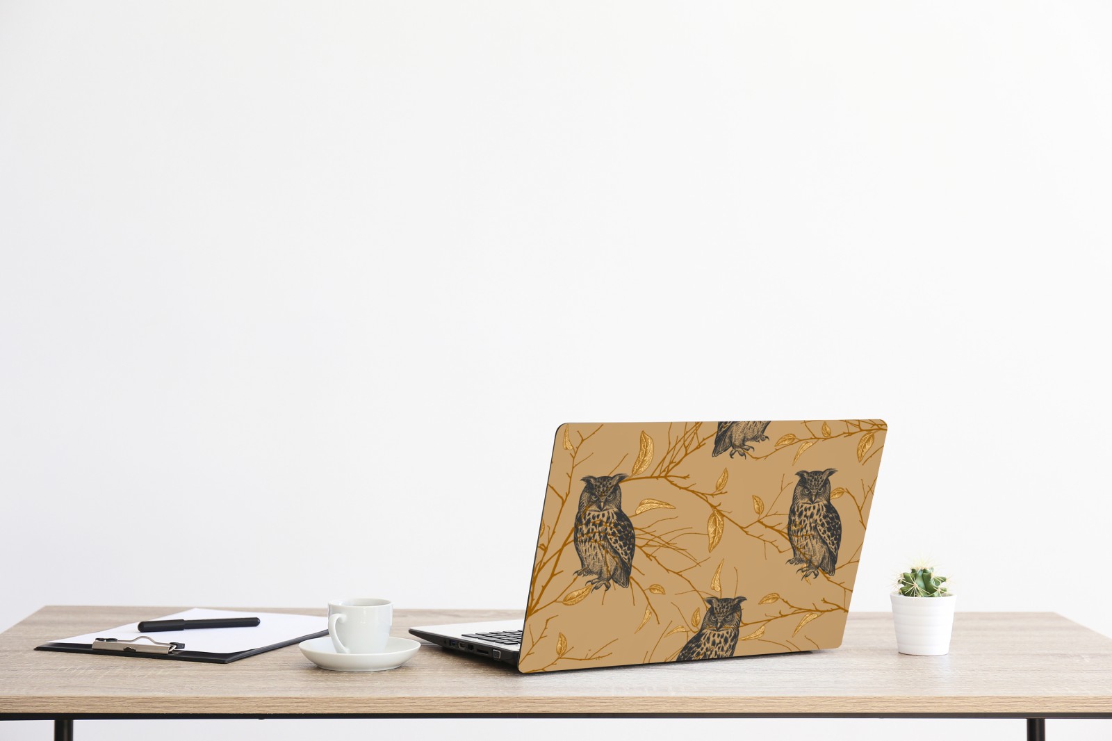 Laptop-Aufkleber goldenes eulenmuster auf beigem hintergrund