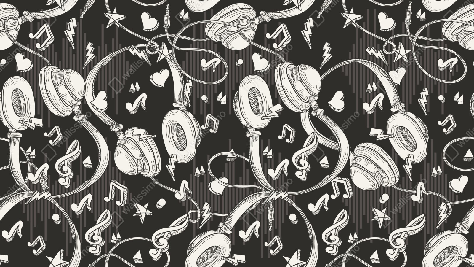 Stilvolles monochromatisches Muster mit skizzenhaften Kopfhörern und Noten, ideal für moderne Räume und kreative Bereiche.