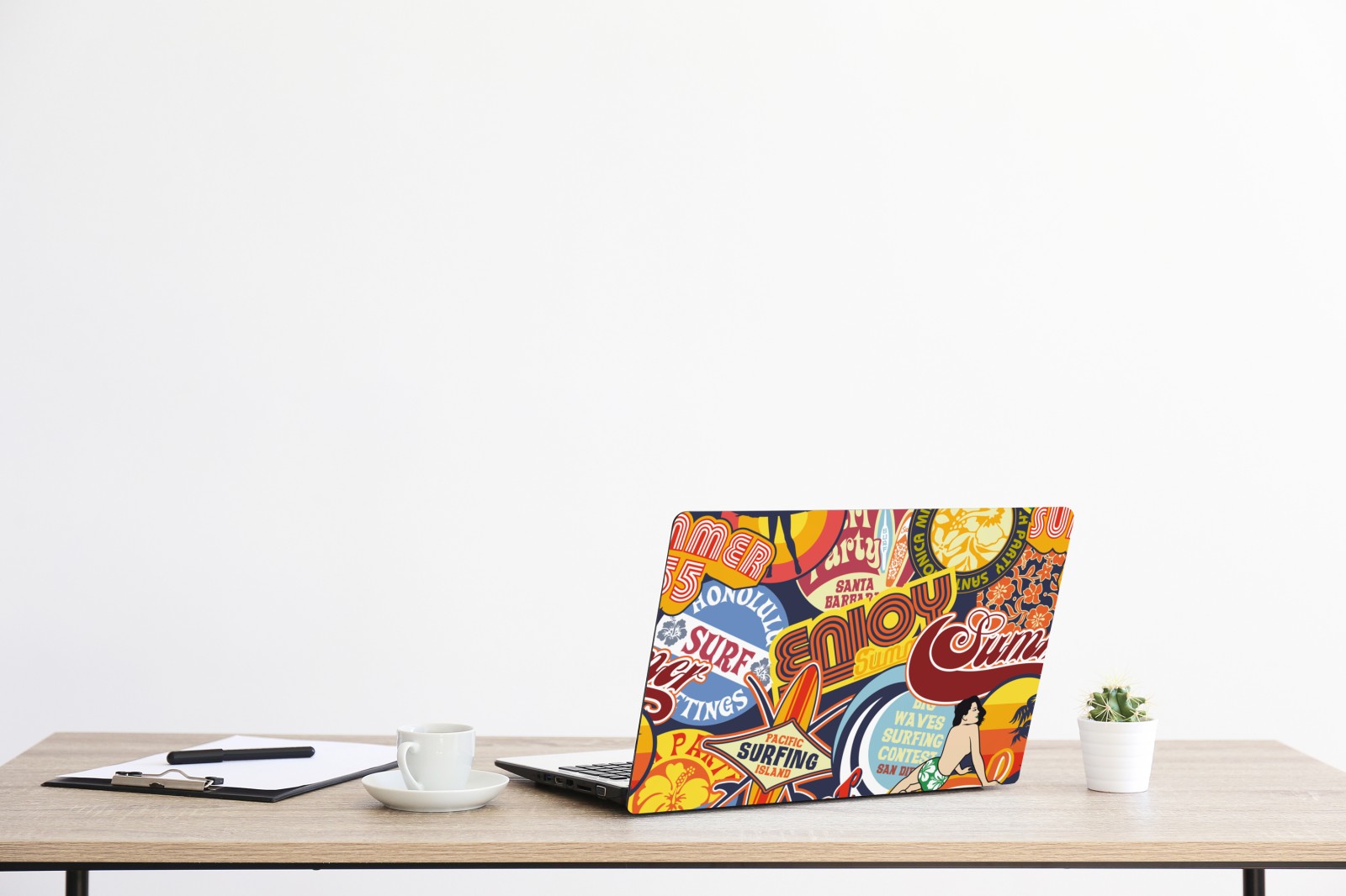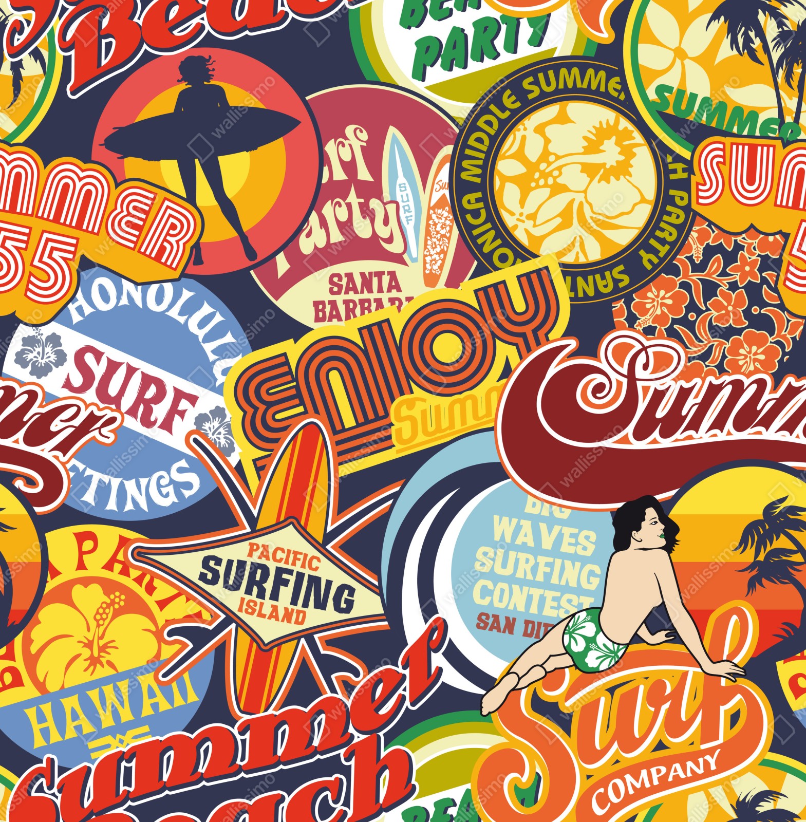 Lebhafte Retro-Surf-Aufkleber-Collage mit tropischen Farben und Strandgefühl, ideal zur Belebung jedes Raums.