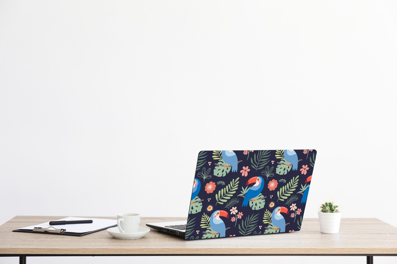 Laptop-Aufkleber tropisches tukanmuster auf dunkelblauem hintergrund