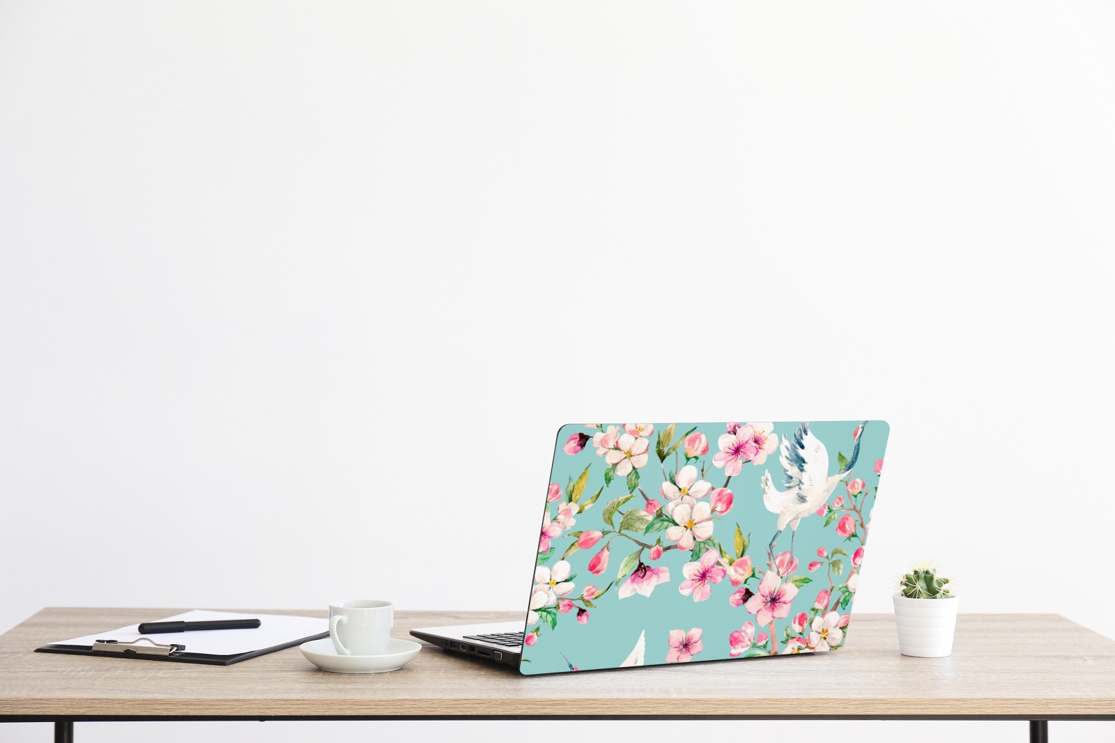 Laptop-Aufkleber türkises kirschblüten- und kranichmuster