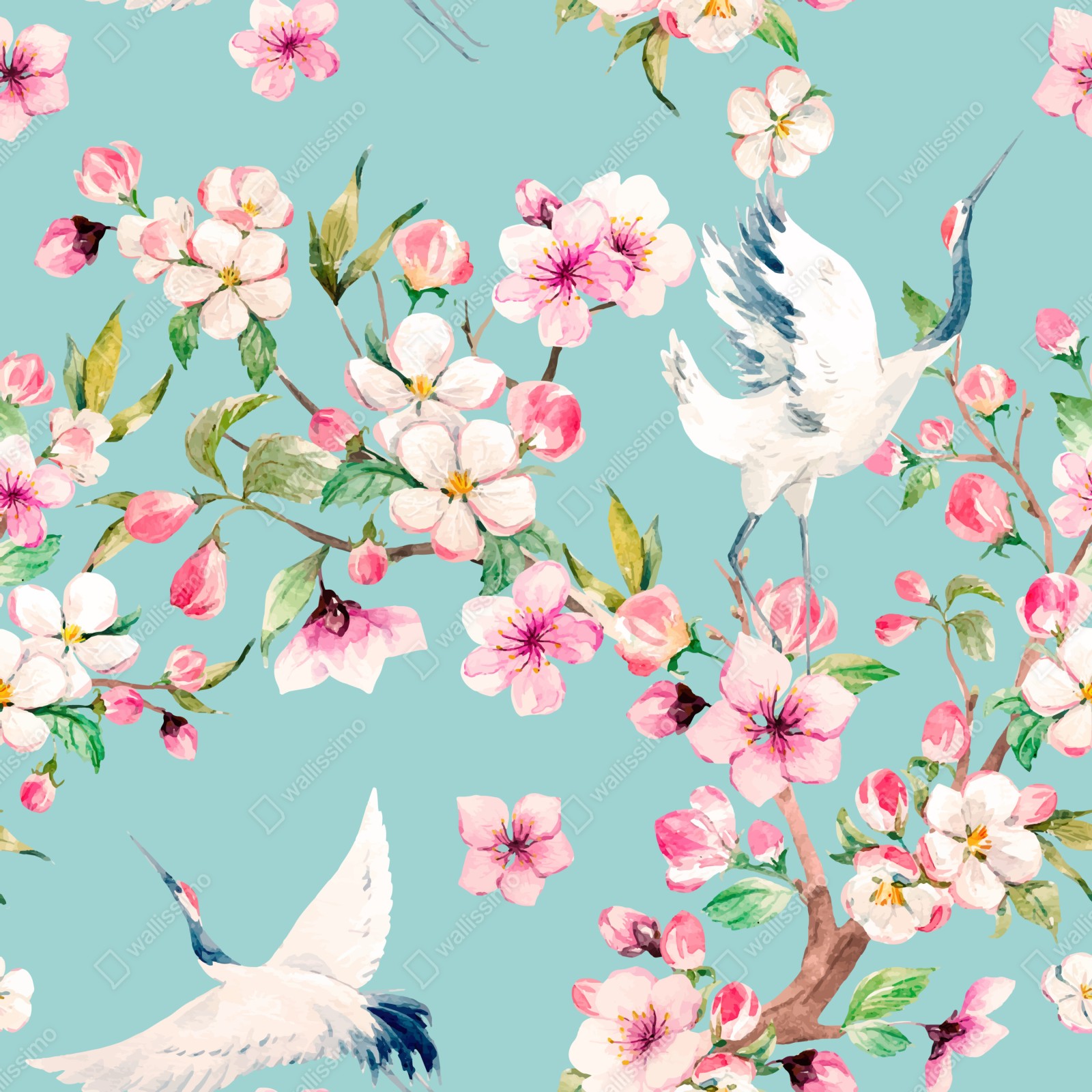 Zarte Aquarell-Kirschblüten und elegante Kraniche auf beruhigendem türkisem Hintergrund verleihen jedem Raum eine ruhige botanische Atmosphäre.