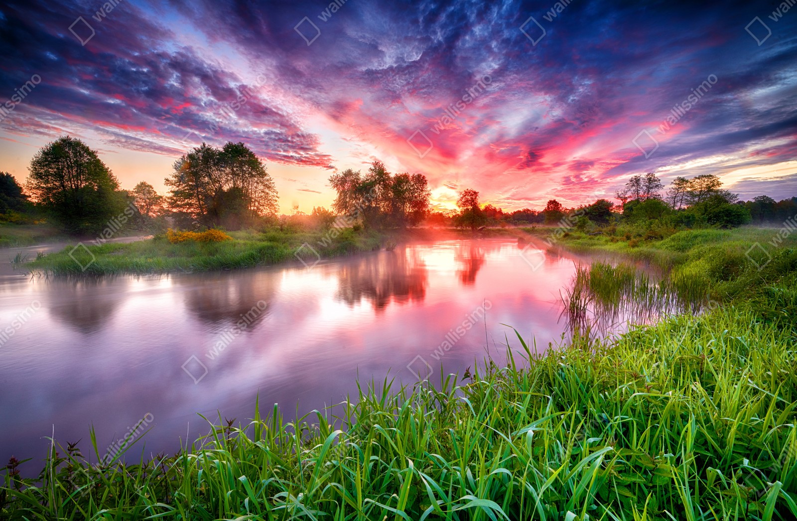 Erleben Sie die ruhige Stimmung eines sommerlichen Sonnenaufgangs am Fluss, lebendige Farben und natürliche Harmonie für jeden Raum.