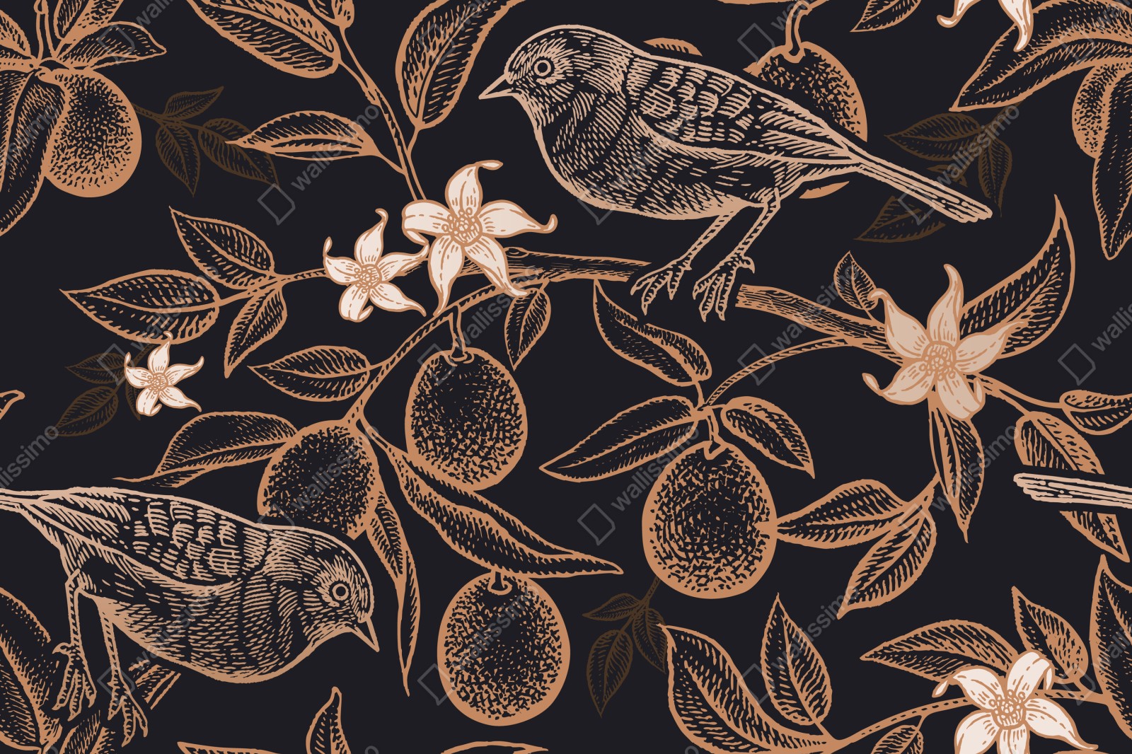 Elegante vintage-botanische Illustration mit Vögeln und Zitrusfrüchten in Gold auf dunklem Hintergrund, ideal um Räumen zeitlosen Charme zu verleihen.
