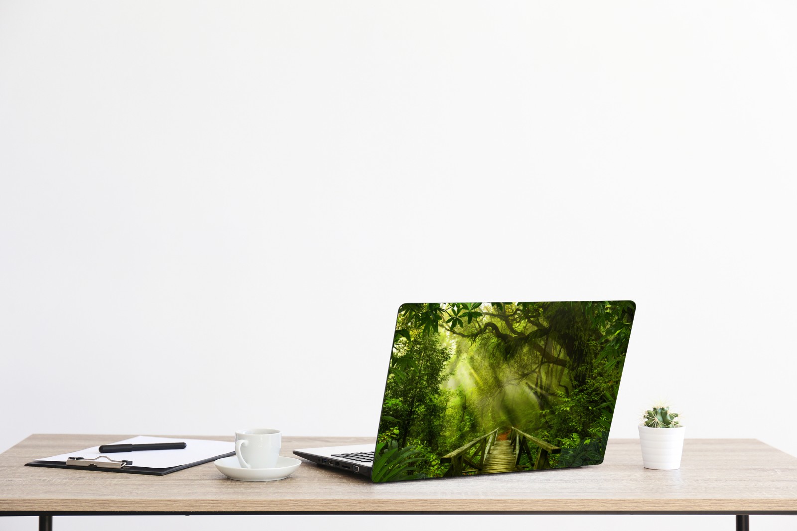 Ein ruhiger, sonnenbeschienener Waldweg, der üppiges Grün und Ruhe ins Zuhause bringt.