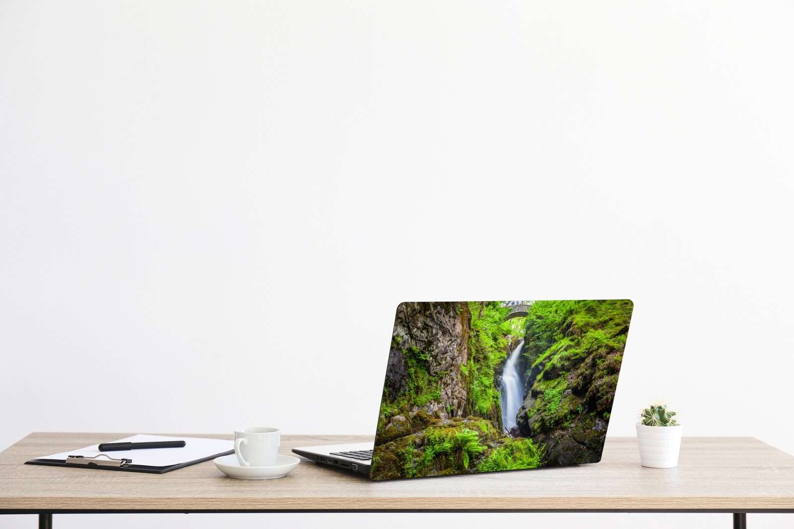 Laptop-Aufkleber wasserfall in moosiger schlucht mit steinbrücke