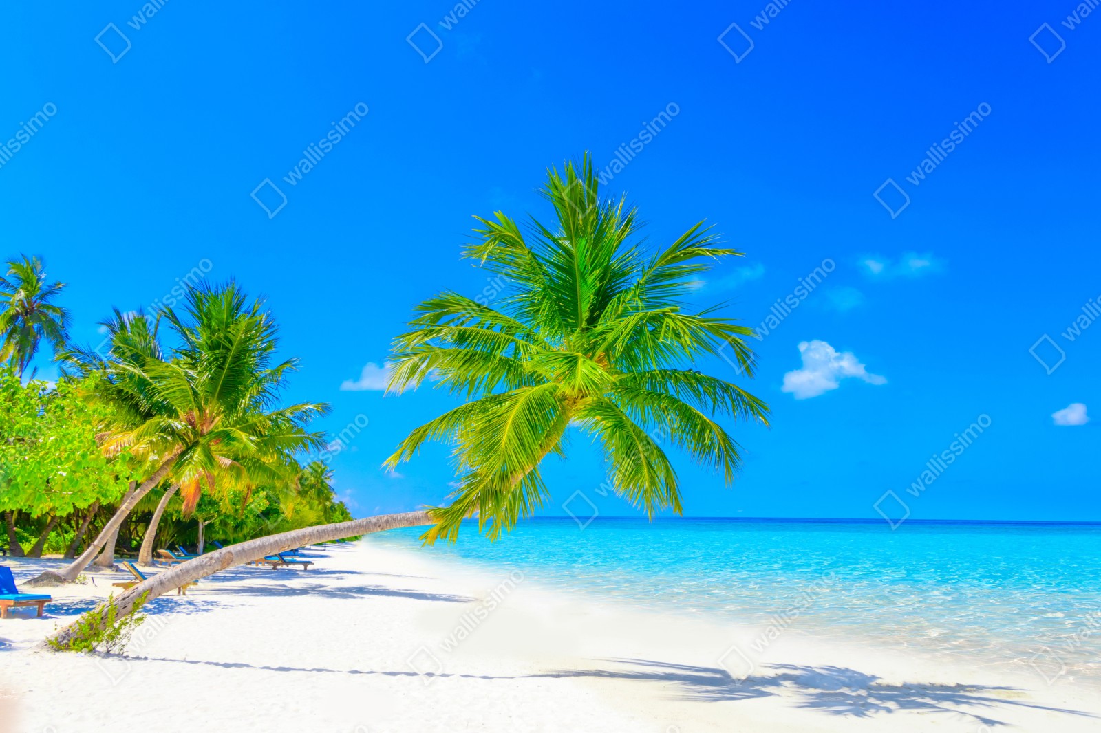 Verleihen Sie Ihrem Raum tropische Ruhe mit sonnigem Strand, kristallklarem Wasser und wiegenden Palmen der Malediven.