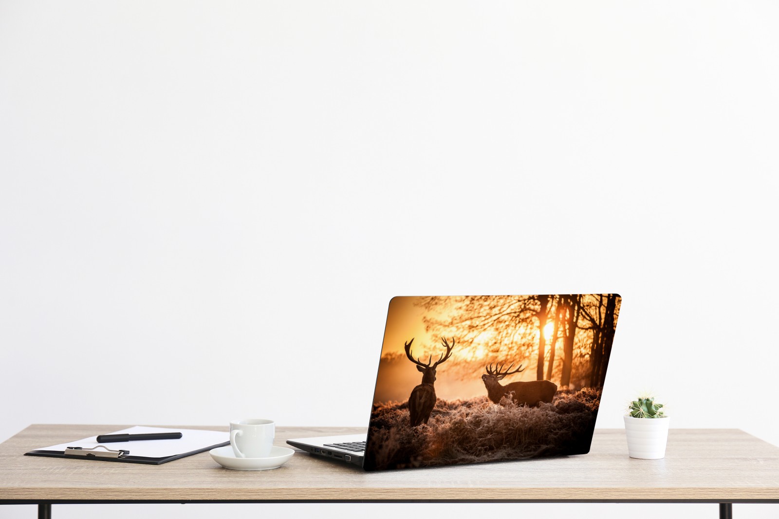 Laptop-Aufkleber goldener sonnenaufgang mit hirschen auf frostiger wiese