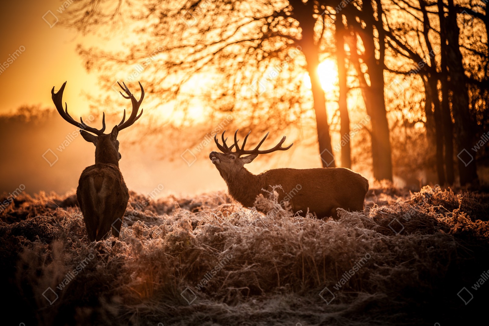 Ein goldener Sonnenaufgang mit zwei Hirschen auf einer frostigen Wiese bringt ruhige, natürliche Atmosphäre an Ihre Wand.