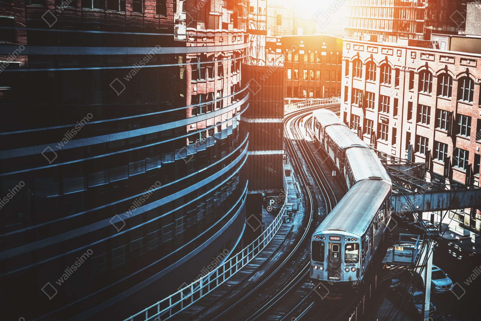 Dynamisches Stadtbild mit einer Hochbahn, die sich im goldenen Licht durch die Innenstadt von Chicago schlängelt, ideal für industrielle und moderne Wohnräume.