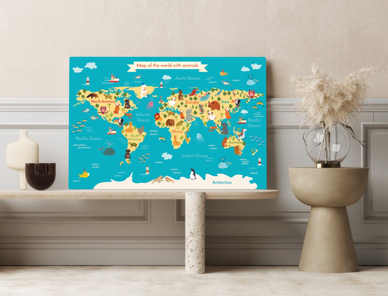 Liebevoll illustrierte Weltkarte mit freundlichen Tieren und lebendigen Farben, perfekt fürs Kinderzimmer und den Unterricht. Pädagogische Wanddekoration, die Neugier weckt.