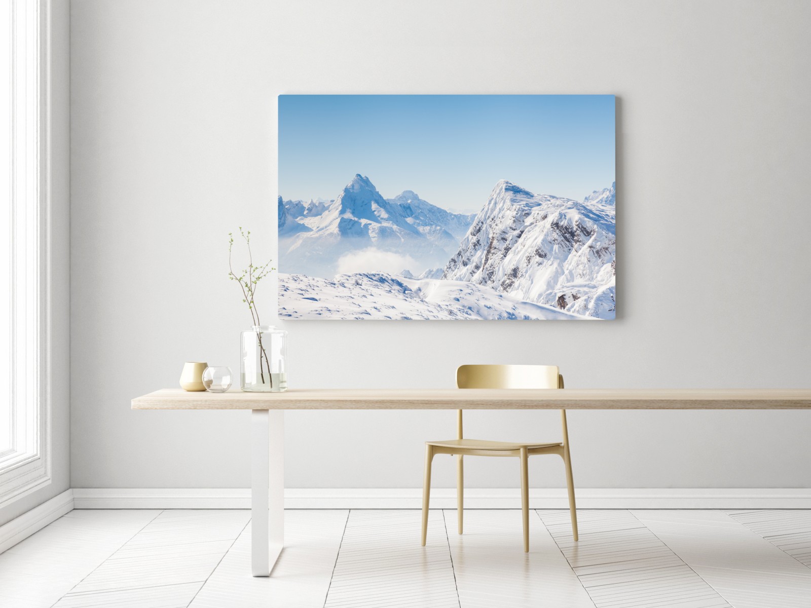 Ein ruhiges Panorama verschneiter Berge bringt frische, alpine Atmosphäre und Weite an Ihre Wände.