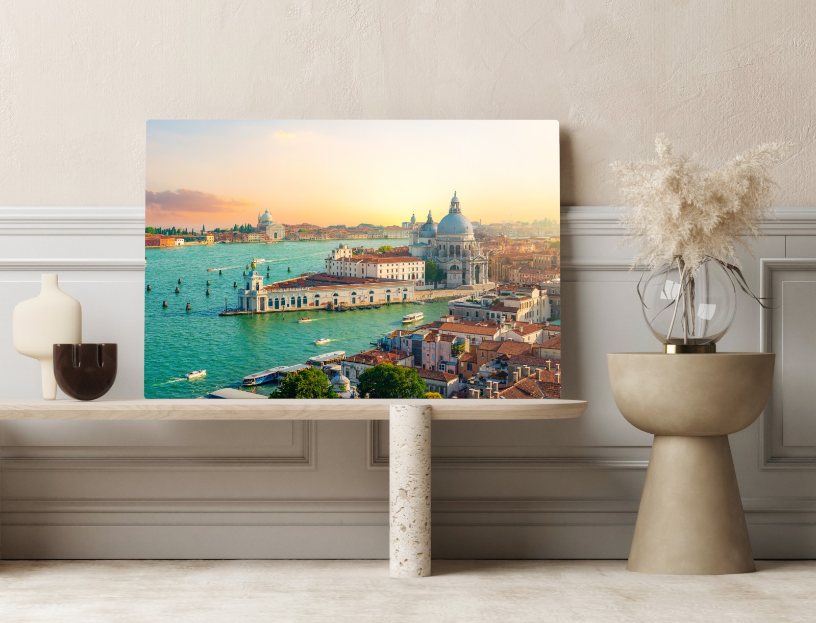 Erleben Sie die zeitlose Schönheit von Venedig mit diesem lebendigen Panoramabild, das historische Kuppeln, schimmernde Kanäle und goldenes Abendlicht einfängt.