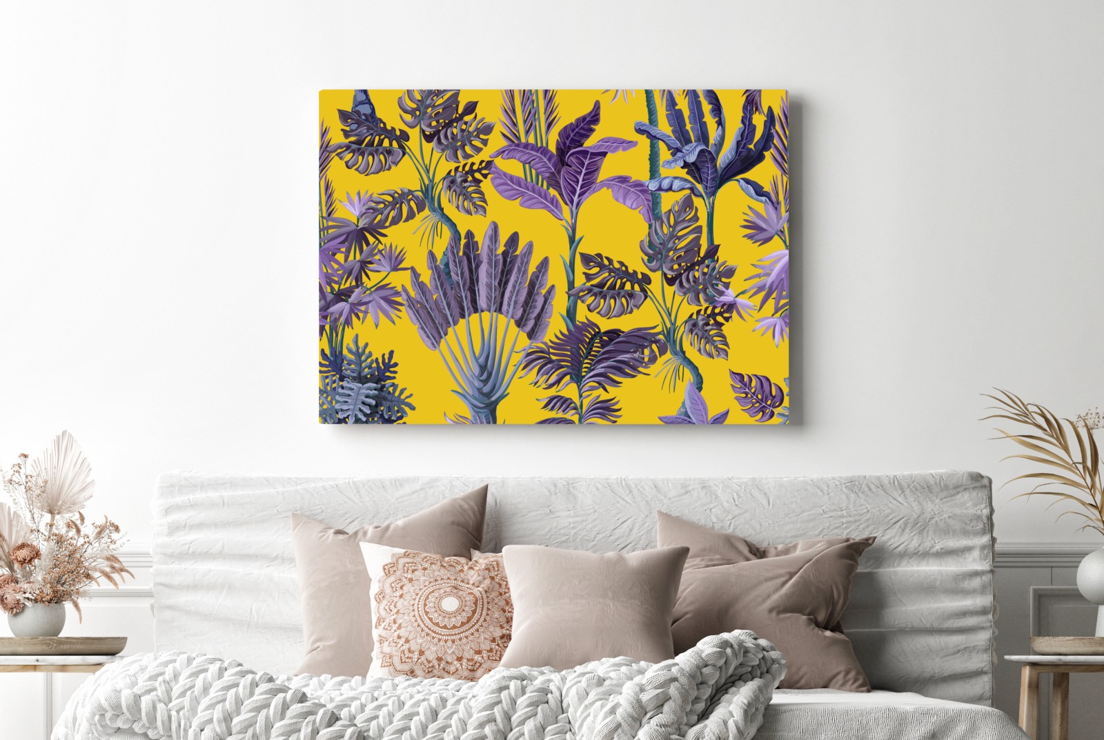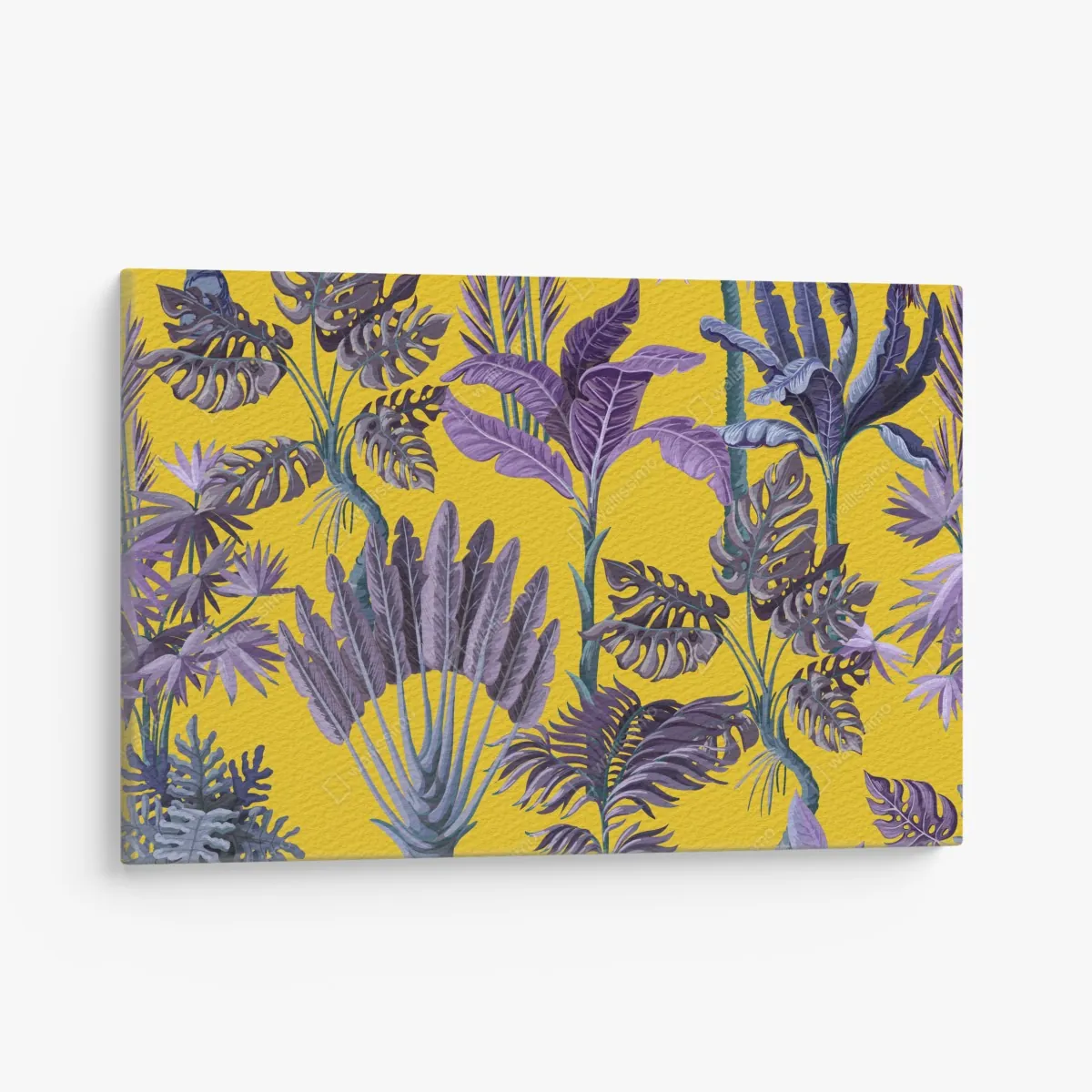 Leinwandbild tropische lila blätter auf gelbem hintergrund