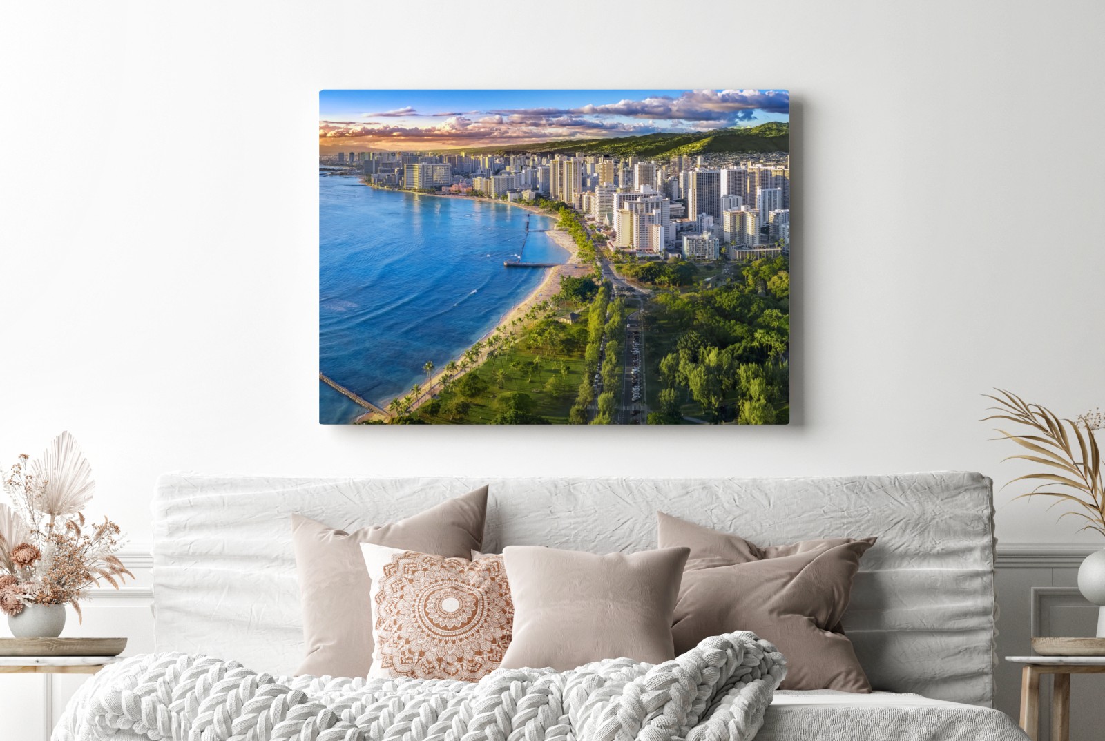 Lebendige Luftaufnahme der Küste und Stadt im Abendlicht, die jeden Raum mit maritimem Flair und Ruhe füllt.