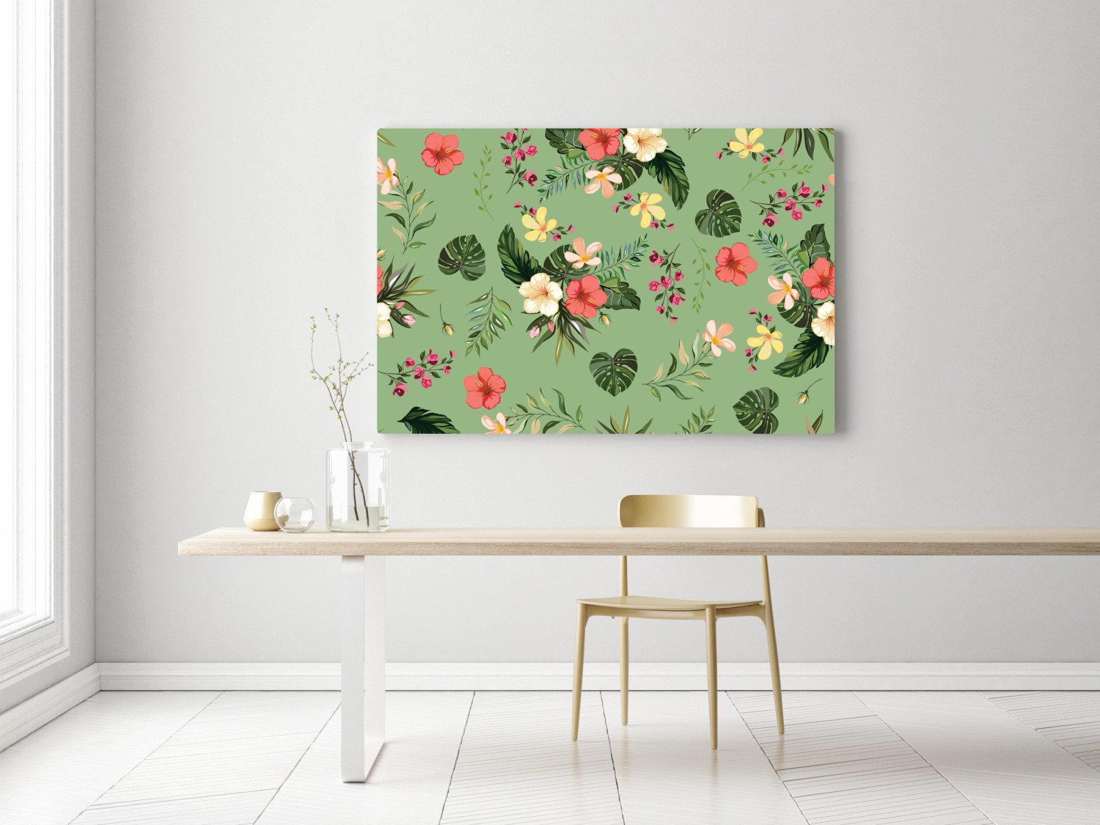 Lebendiges tropisches Blumenmuster mit Hibiskus und üppigen Blättern bringt frisches botanisches Flair in jeden Raum.