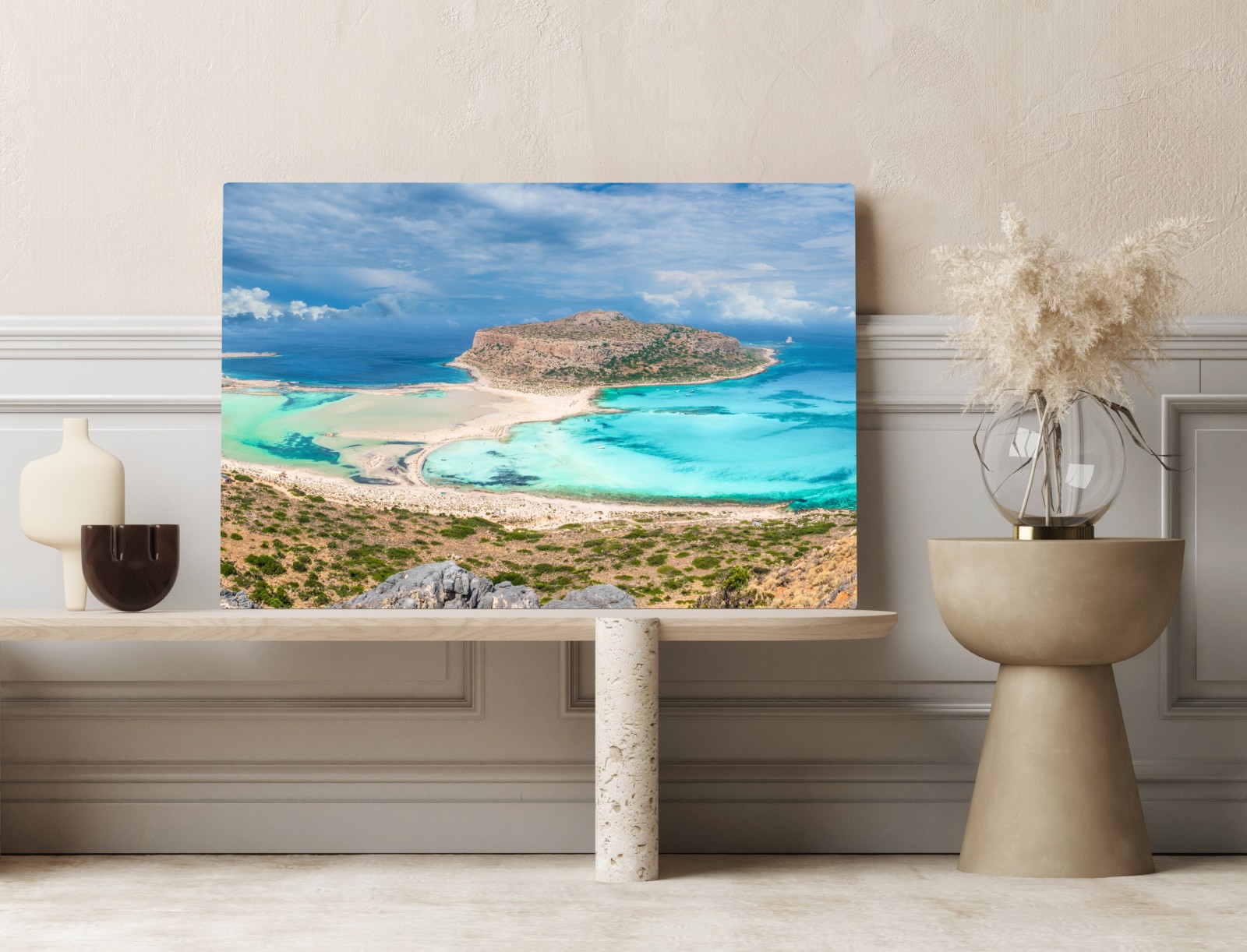 Holen Sie das sanfte Türkiswasser und die sonnigen Strände von Balos Lagoon in Ihren Raum mit diesem panoramischen Küstenmotiv, das Ruhe und Urlaubsgefühl vermittelt.