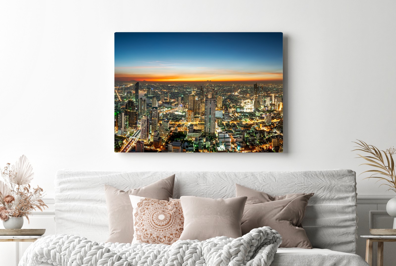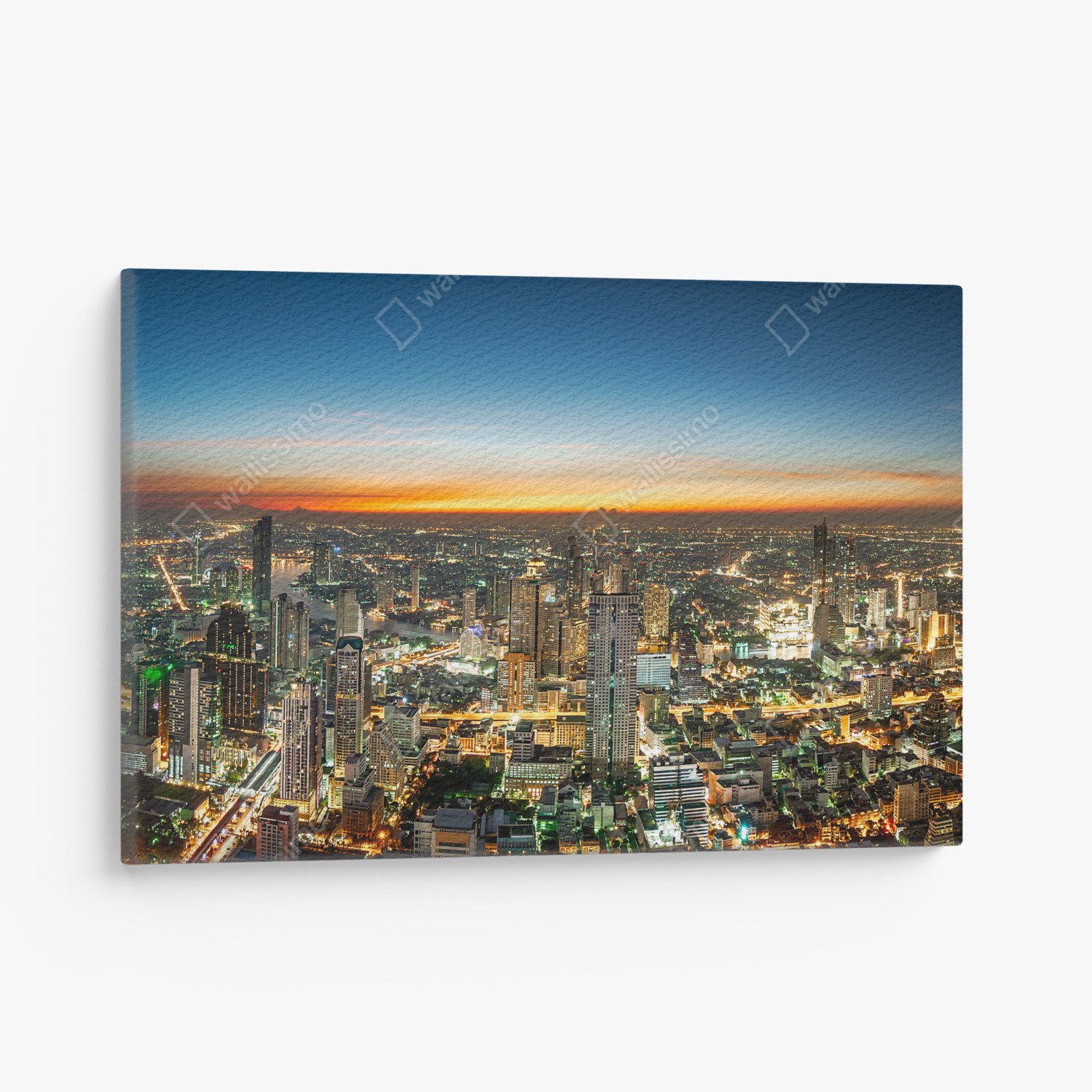 Weite nächtliche Panoramaansicht von Bangkok am Chao Phraya mit funkelnden Lichtern und dramatischem Abendhimmel, perfekt um Räumen urbanes Flair zu verleihen.