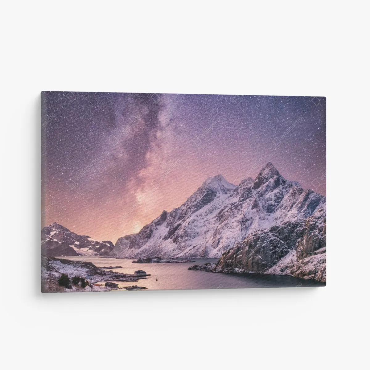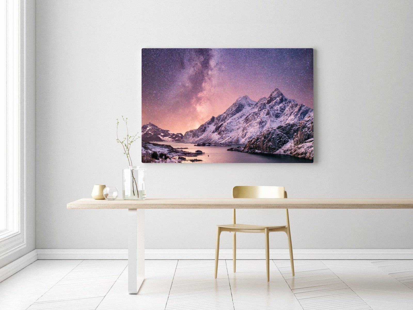 Atemberaubende Nachtlandschaft mit der Milchstraße über schneebedeckten Gipfeln, die sich in einem ruhigen Fjord spiegeln, ideal um Räumen Ruhe und Weite zu verleihen.